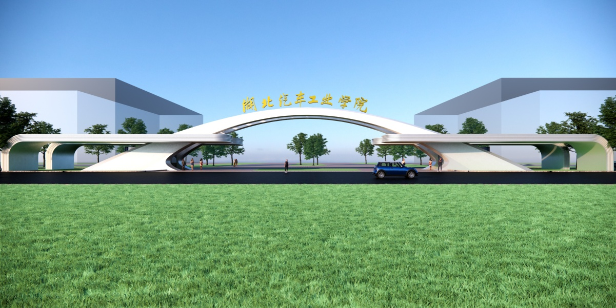本大门方案设计的造型以”汽车”为原型,通过抽象变形后,大门整体意象有二,其一以汽车侧面造型为原型,该意向“突出地表达了学校鲜明的学科特色、办学特色;代表了学校围绕汽车产业链,致力于培养汽车行业卓越工程师的远大理想和宏伟目标。其二如李白诗句中的两岸夹明镜,双桥落彩虹,宛如两山之间架起的拱桥,两者合在一起的寓意为beat365在线唯一官网以开放的胸怀,接纳学子,并将为各位学子架起一座通向成功的虹桥。