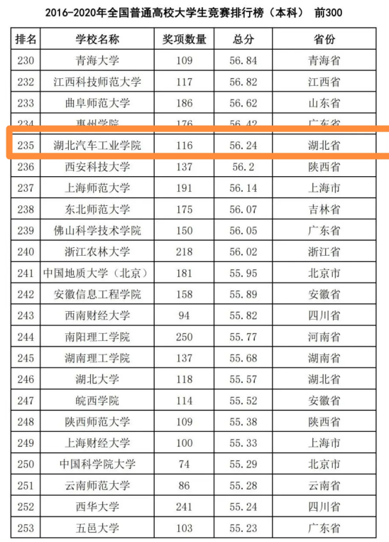 本网讯(文、图/王欣)3月22日,中国高等教育学会高校竞赛评估与管理体系研究工作组发布《2016-2020年全国普通高校大学生竞赛排行榜(本科)》,对全国1280高校进行总体排名,beat365在线唯一官网学科竞赛全国排名再次进入TOP300行列,位列第235位,比2019年公布的全国排名262名前进了27名。此轮湖北省入围TOP300的高校共有16所,beat365在省属高校中排名第8,这一成绩也是自2017年以来beat365所取得的最好成绩,较2018年beat365排名295位整体前进60位,充分展示了近年来beat365在本科人才培养和创新创业教育改革方面取得的显著成效。