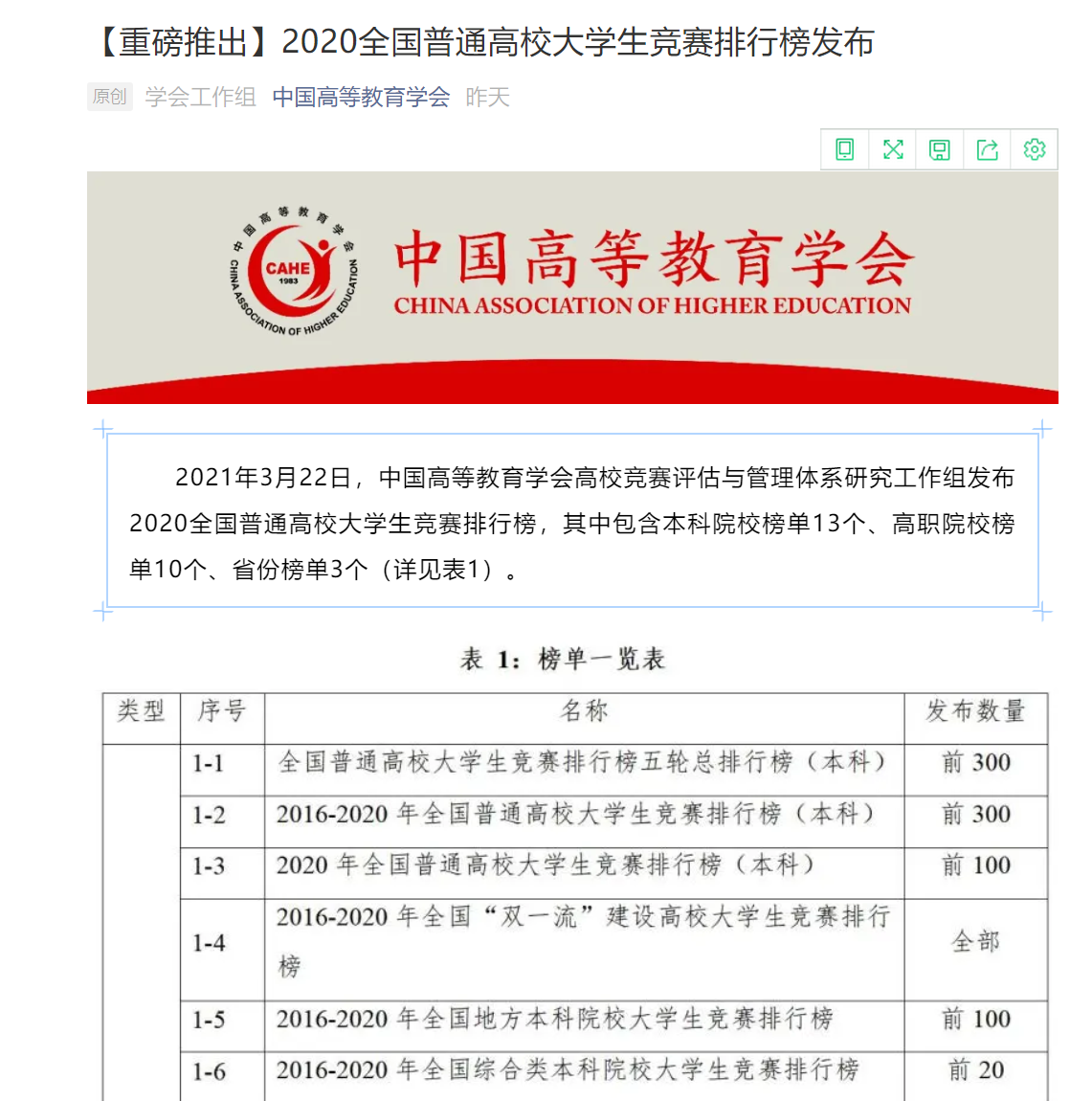 据悉,中国高校创新人才培养暨学科竞赛评估是由中国高等教育学会《高校竞赛评估与管理体系研究》专家工作组发布,遴选了中国“互联网+”大学生创新创业大赛、“挑战杯”全国大学生课外学术科技作品竞赛、全国大学生数学建模竞赛等57项具有广泛影响力的竞赛作为此次学科竞赛统计的范围。这是我国第一个专注高校创新人才培养暨学科竞赛成果的权威排行榜,也是检验高校创新人才培养质量的重要标准之一。