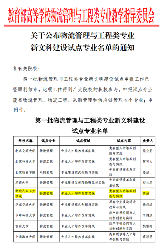 本网讯(文/贾静、何波)近日,教育部高等学校物流管理与工程类专业教学指导委员会公布49个专业点列入第一批物流管理与工程类专业新文科建设试点专业名单,beat365物流管理专业成功获批为新文科建设试点专业。