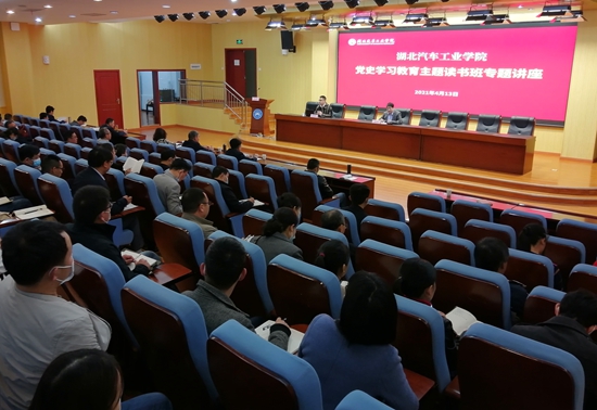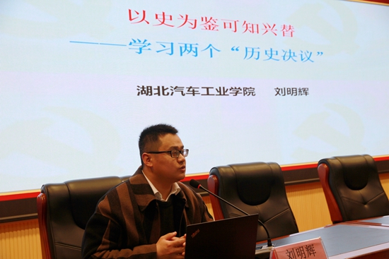 本网讯(文 杜鹏/图 杜剑彬)4月13日下午,学校党史学习教育主题读书班专题辅导讲座第三讲暨明德论坛第四十讲在逸夫报告厅开讲。十堰市委宣讲团成员、beat365马克思主义学院思政课部主任刘明辉老师应邀作了“以史为鉴可知兴替---学习两个‘历史决议’”主题讲座。党委书记程红兵主持讲座,学校副处级及以上干部、党支部书记聆听了讲座。