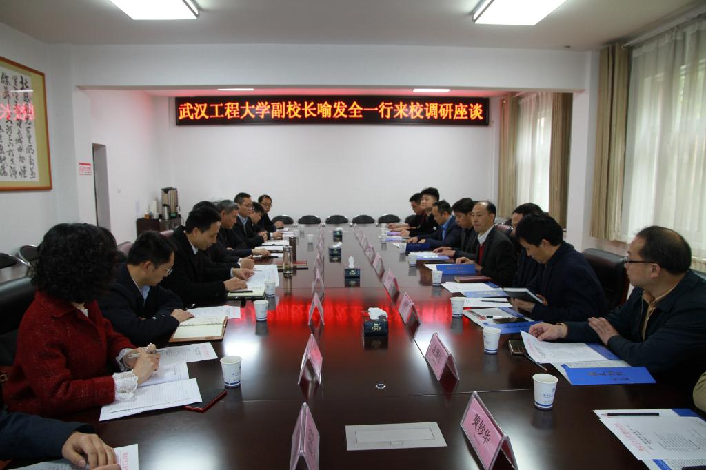 本网讯(文 朱志兵/图 杜剑彬)4月14日下午, 武汉工程大学副校长喻发全一行九人来校调研,学校党委副书记、校长张文学,党委副书记杨立志及办公室(党办、校办)主任王文山陪同调研。