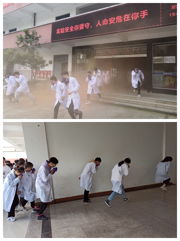 第三阶段是火灾紧急疏散演练,随着烟幕弹冒出浓烟、火灾警报声响起,紧急疏散演练正式开始。在疏导员引导下,实验室内的师生按照逃生要求用毛巾等捂住口鼻,低头弯腰,靠墙而行,快速有序撤离到楼下疏散地点。