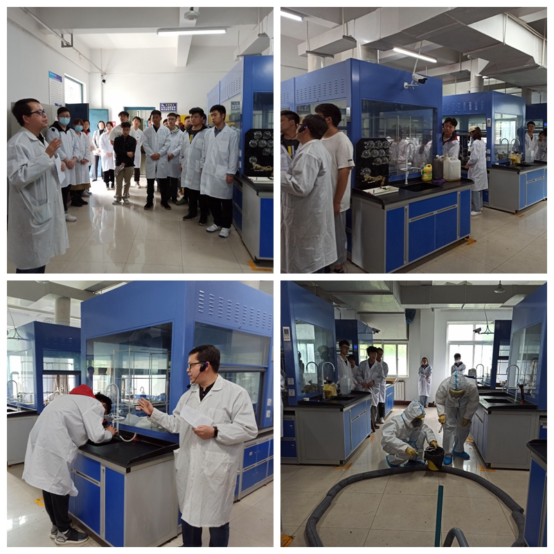 演练活动分为四个阶段。第一阶段是实验室教师讲解化学实验室应急处置知识和方法;第二阶段是酸性液体泄露处置演练,演练模拟了实验过程中突发酸性液体泄露发生后的现场紧急自救、事故上报与联系急救、救援专业处理、环保应急处理等应急处置流程。