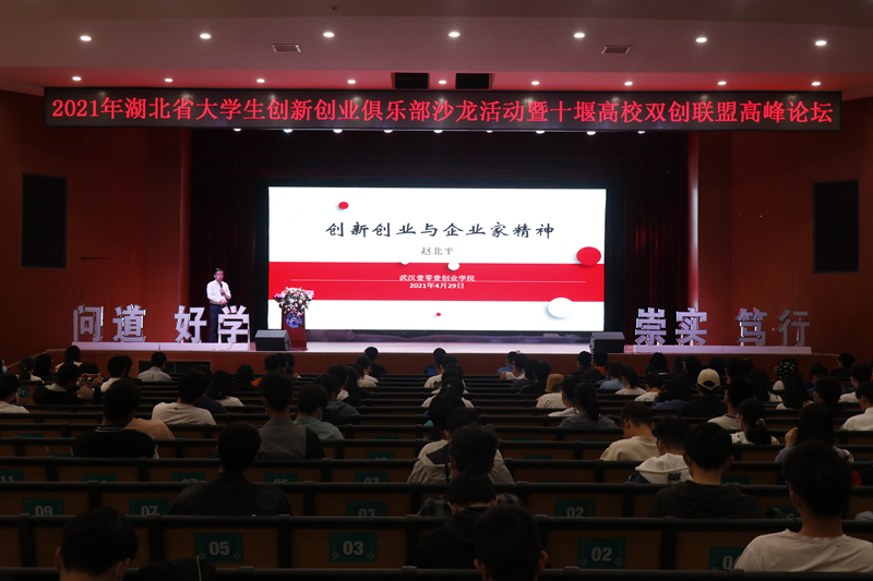 beat365在线唯一官网学工部部长陶伟在大礼堂主持高峰论坛第三分会场“2021年湖北省大学生创新创业俱乐部沙龙”专题活动,武汉工商学院副校长赵北平做了《创新创业与企业家精神》的专题报告,湖北省高等学校毕业生就业指导服务中心蔡晨磊部长、张杰和陆艺副部长出席本次报告会,十堰高校近700名学生代表聆听了精彩报告。
