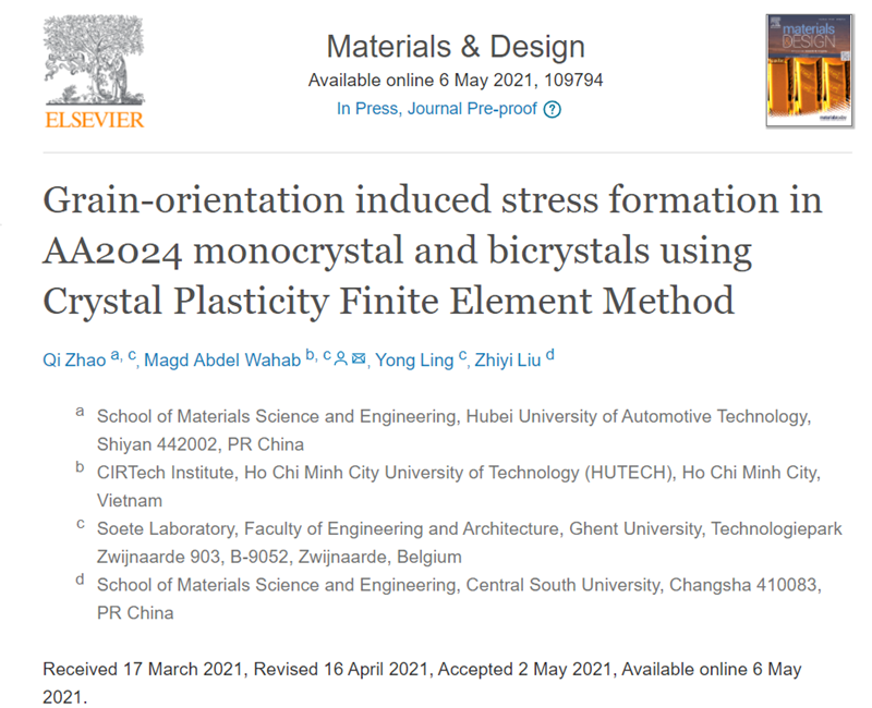 本网讯(文/赵齐)最近,国际材料科学顶级期刊《Materials & Design》(中科院1区top期刊,IF=6.289),刊登了beat365在线唯一官网材料学院和比利时根特大学有限元实验室的联合研究论文《Grain-orientation induced stress formation in AA2024 monocrystal and bicrystals using Crystal Plasticity Finite Element Method》。beat365材料学院赵齐副教授为文章第一作者,比利时根特大学工程系Magd Abdel Wahab教授为文章的通讯作者。参与合作研究的还包括比利时根特大学工程系凌勇研究员及中南大学材料学院刘志义教授。
