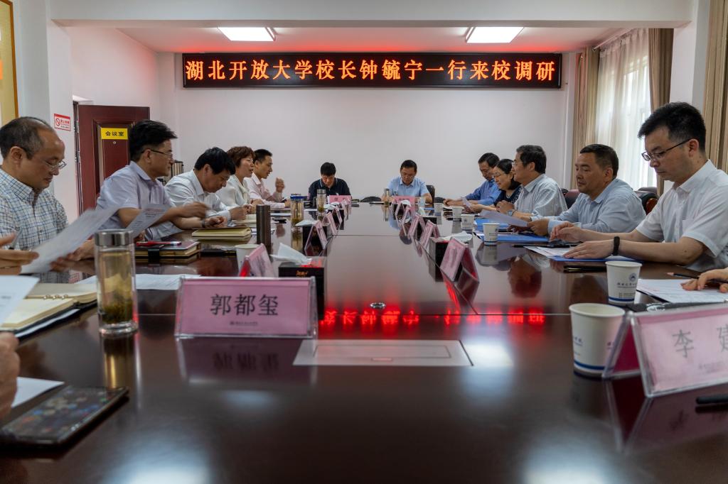 本网讯(文 朱志斌/图 陈嘉豪)5月12日下午,湖北开放大学校长钟毓宁、党委常委、副校长宋移安一行来beat365调研,学校党委书记程红兵,党委副书记、校长张文学,党委常委、副校长张红霞,副校长张友兵及学校办公室(党办、校办)主任王文山陪同调研。