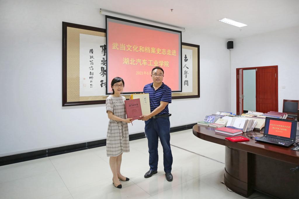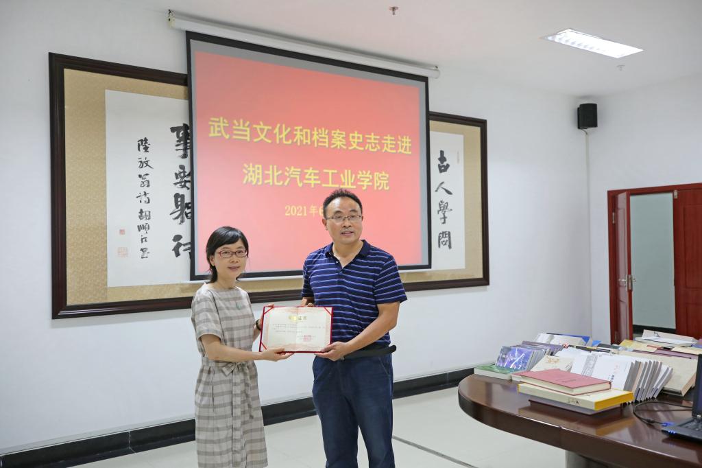 范主任致辞指出,武当文化是中华文化瑰宝,通过“进机关、进农村、进社区、进校园、进企业、进社会团体”活动,用武当文化和档案史志文化教育人、启迪人、警示人,让更多人认识武当文化,了解档案史志,热爱武当、建设武当。图书馆毕丽芳馆长向范学锋主任颁发了收藏证。