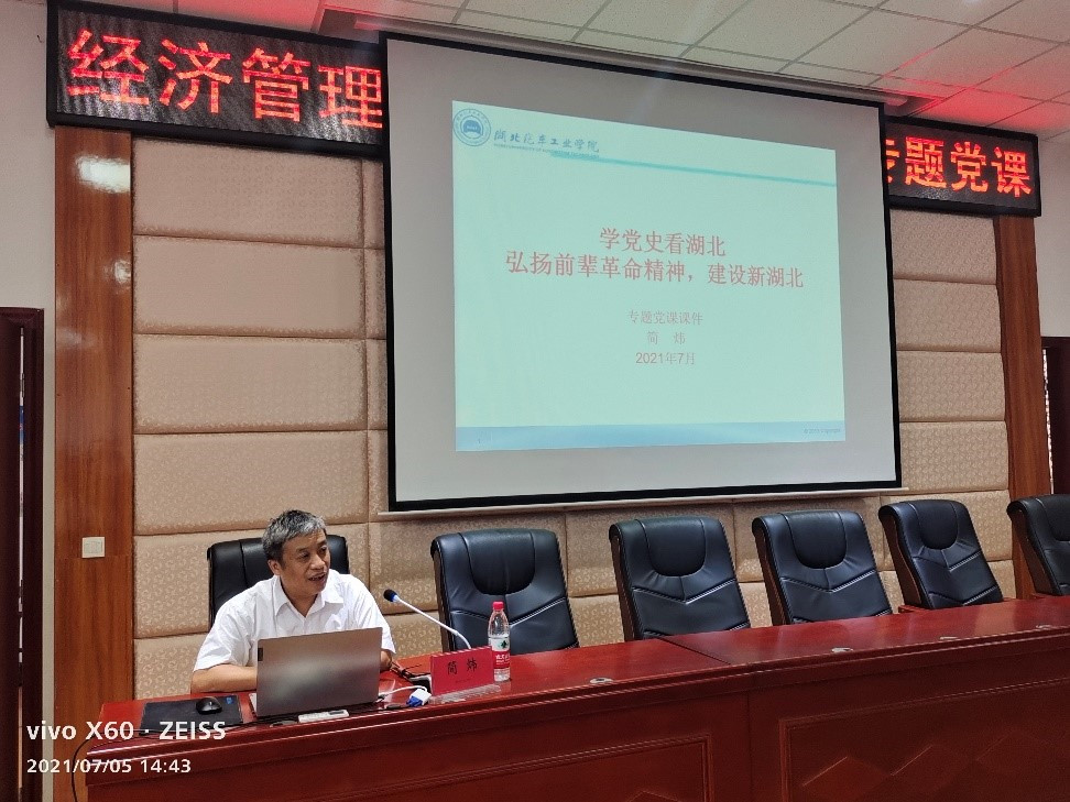 简炜以“学党史看湖北,弘扬前辈革命精神,建设新湖北”为题,回顾了新民主主义革命时期,党的成立、发展、壮大的艰苦卓绝的斗争史和光辉历程,同时讲授了湖北省在新民主主义革命时期的重要地位、湖北共产党人和湖北人民为推翻三座大山、为抗战胜利、为取得新民主主义革命胜利作出的巨大牺牲和重大贡献。
