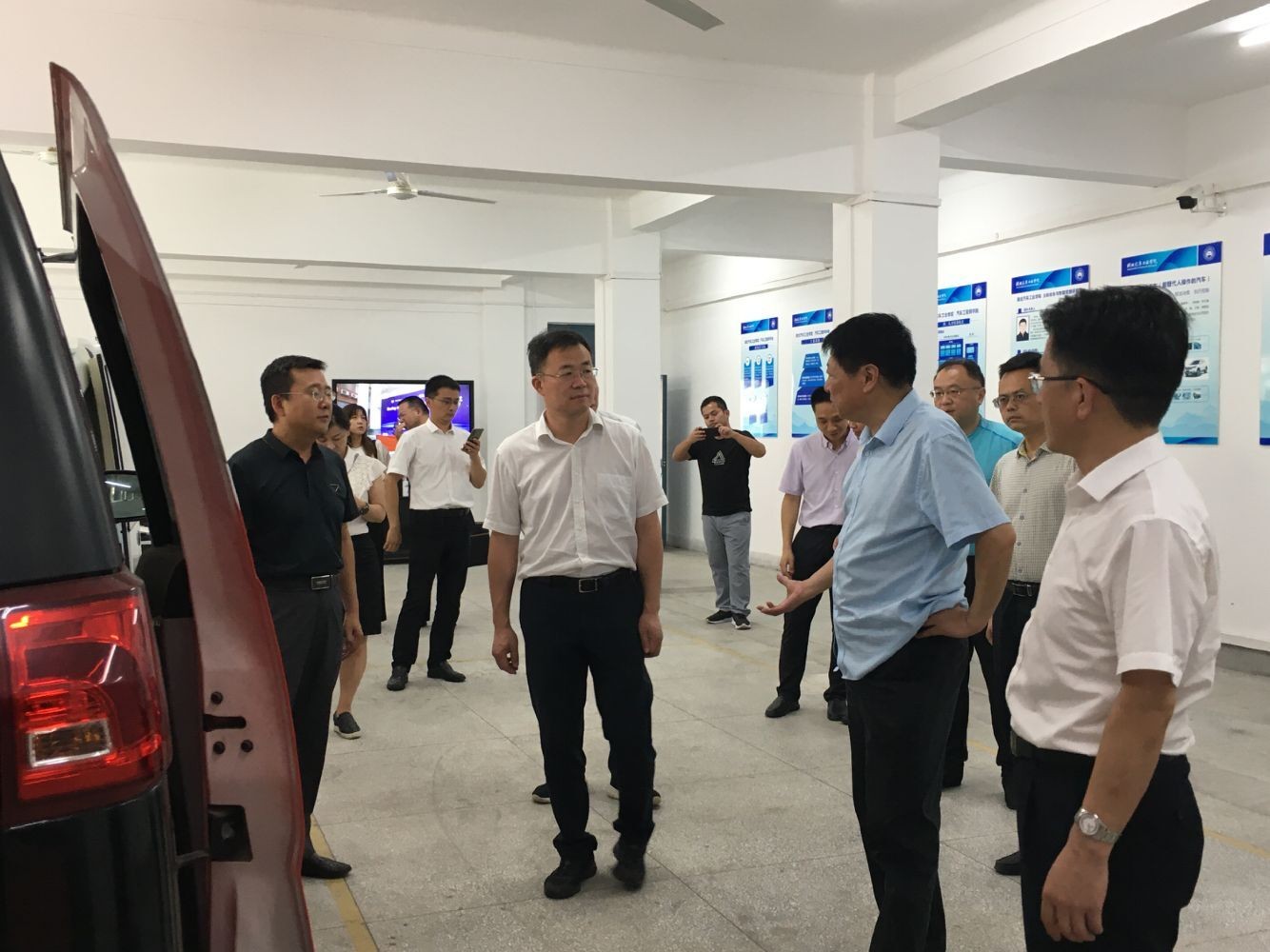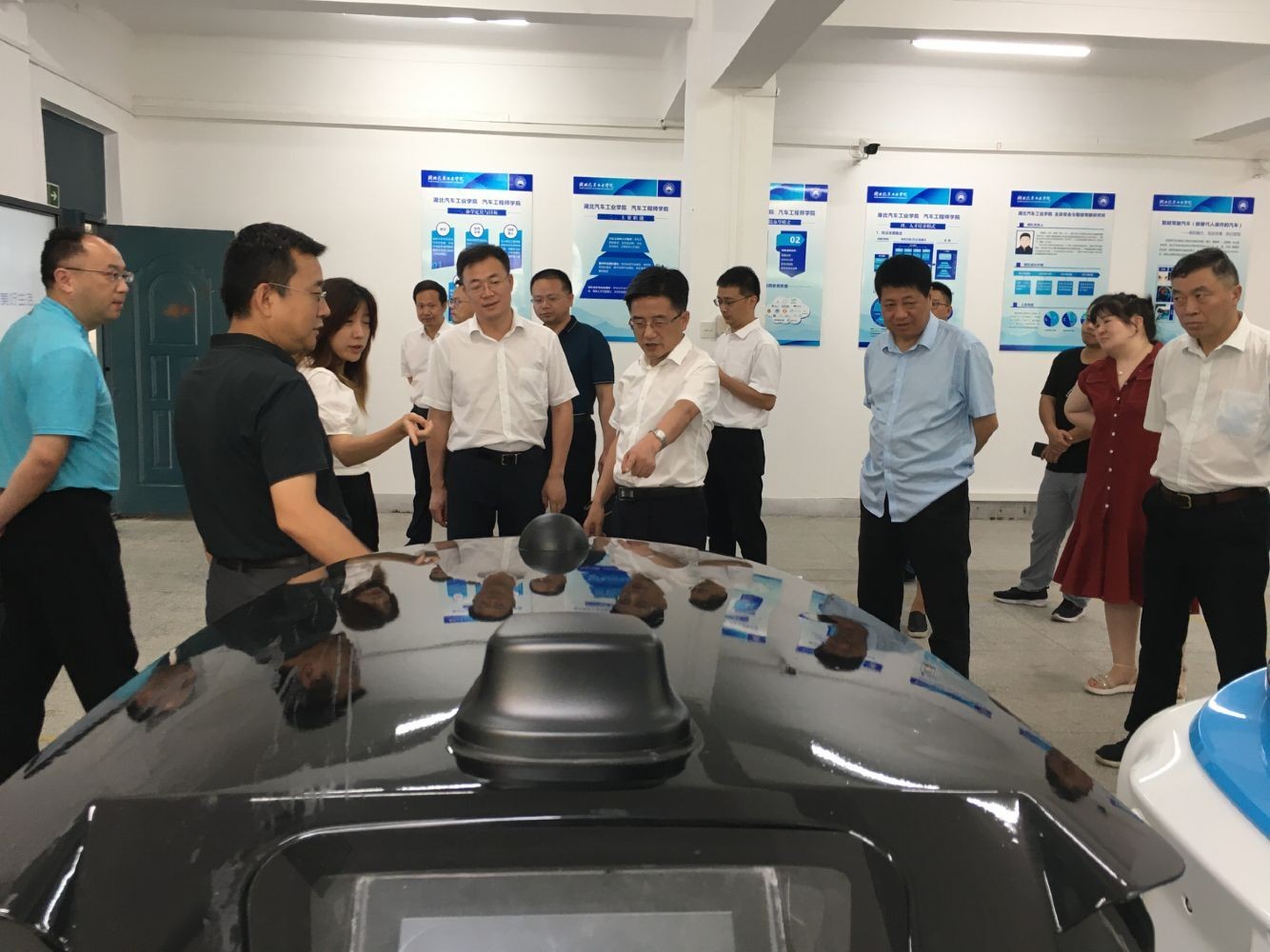 吴骏一行首先参观了学校主动安全与智能驾驶研究所、汽车动力传动与电子控制湖北省重点实验室、国家级制造装备数字化分中心,详细听取了实验室相关介绍,并对实验室所做工作及取得的成绩表示赞许。