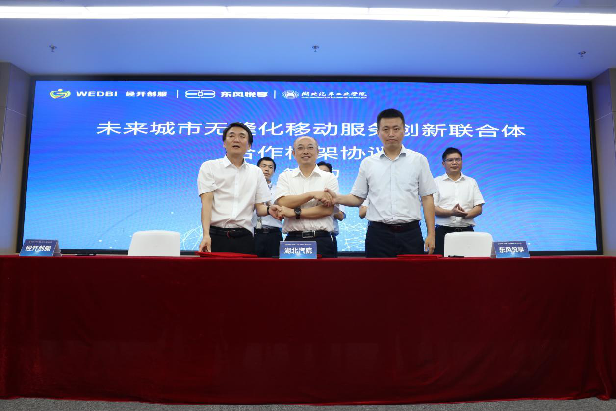 紧接着,学校张友兵副校长、东风悦享李凯总经理、武汉经开创服翟江岸总经理共同签署了《三方战略合作框架协议》。