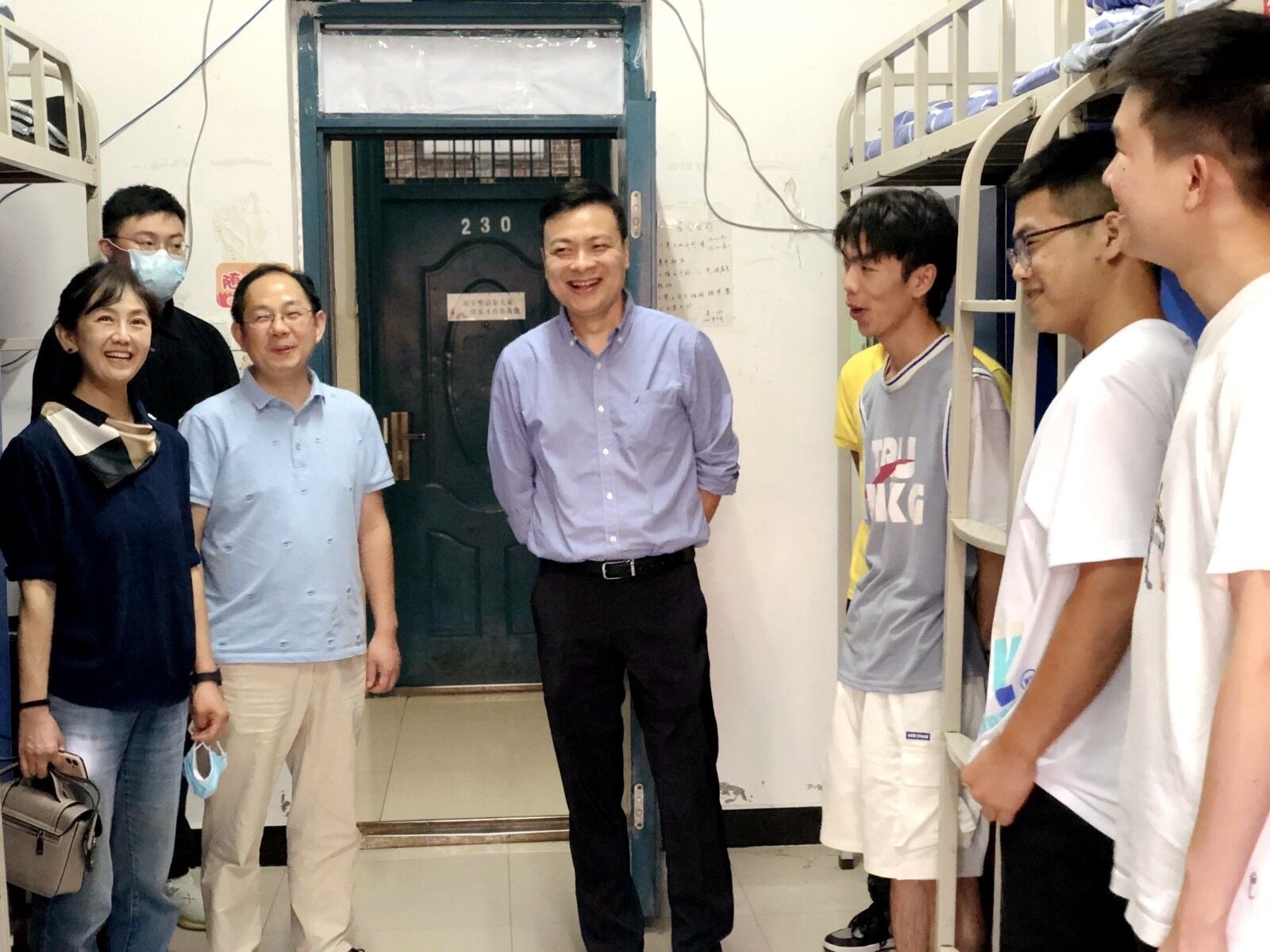 本网讯(文/卢旭)新学期伊始,为了解数理与光电工程学院新生在校的住宿条件和生活状况,给同学们创造一个良好的校园环境。9月9日下午,副校长高刃在数理与光电工程学院分党委书记张默、院长黄海铭、新生班主任及辅导员的陪同下深入2021级新生宿舍,实地了解新生到校后的学习与生活情况,视察学生宿舍设施及生活服务保障情况,亲切看望慰问2021级新生。