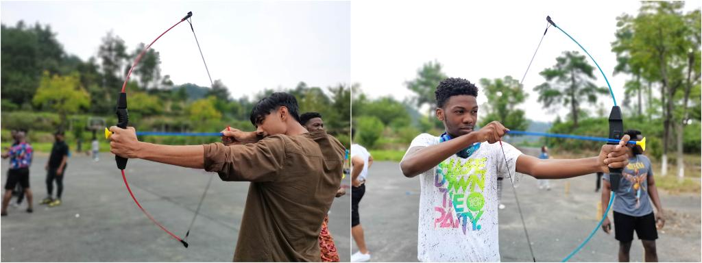 中秋的由来和传说中流传最广的是后羿射日、嫦娥奔月,这次留学生们化身“后羿”传承人,感受射箭的快乐。