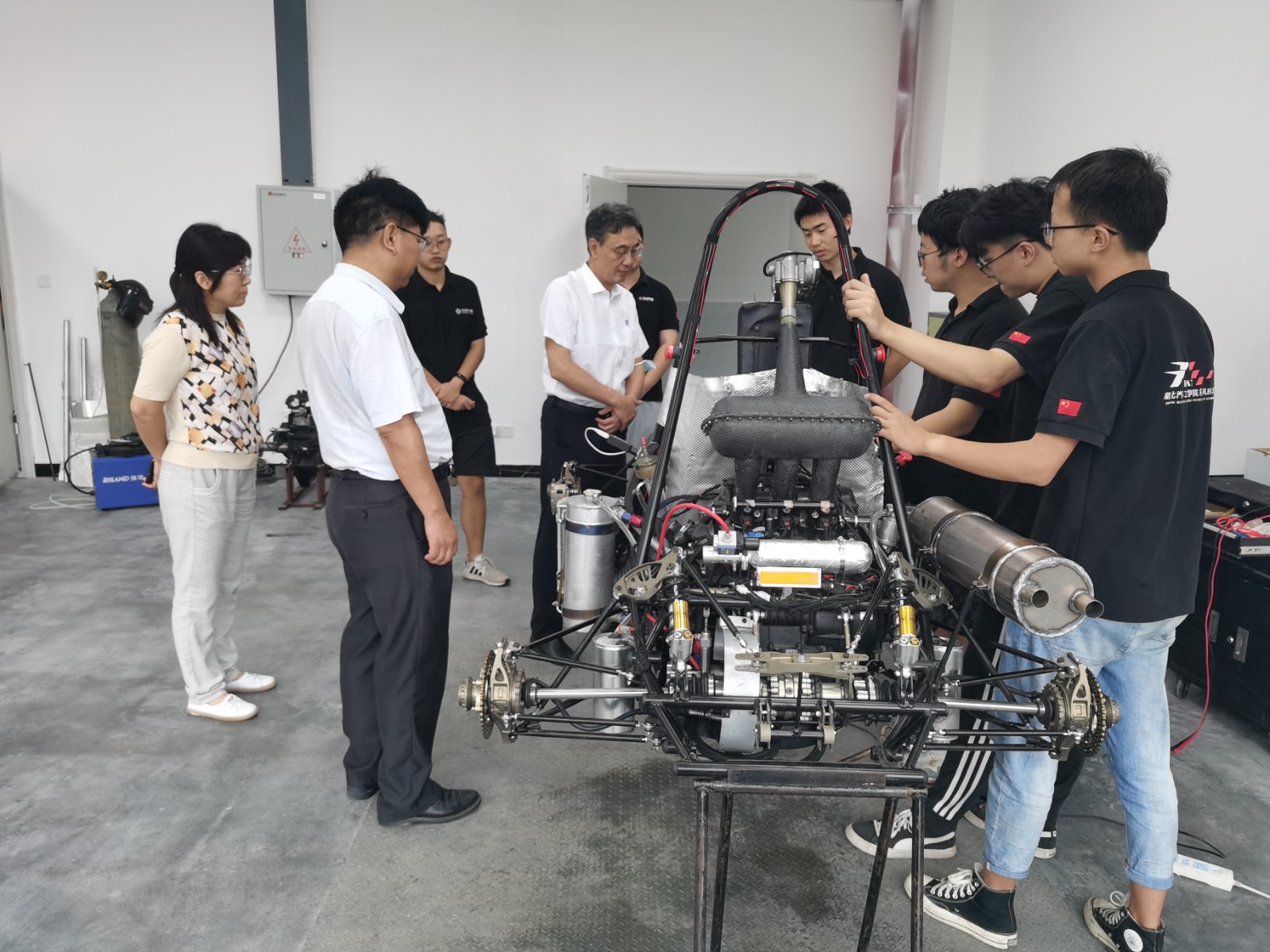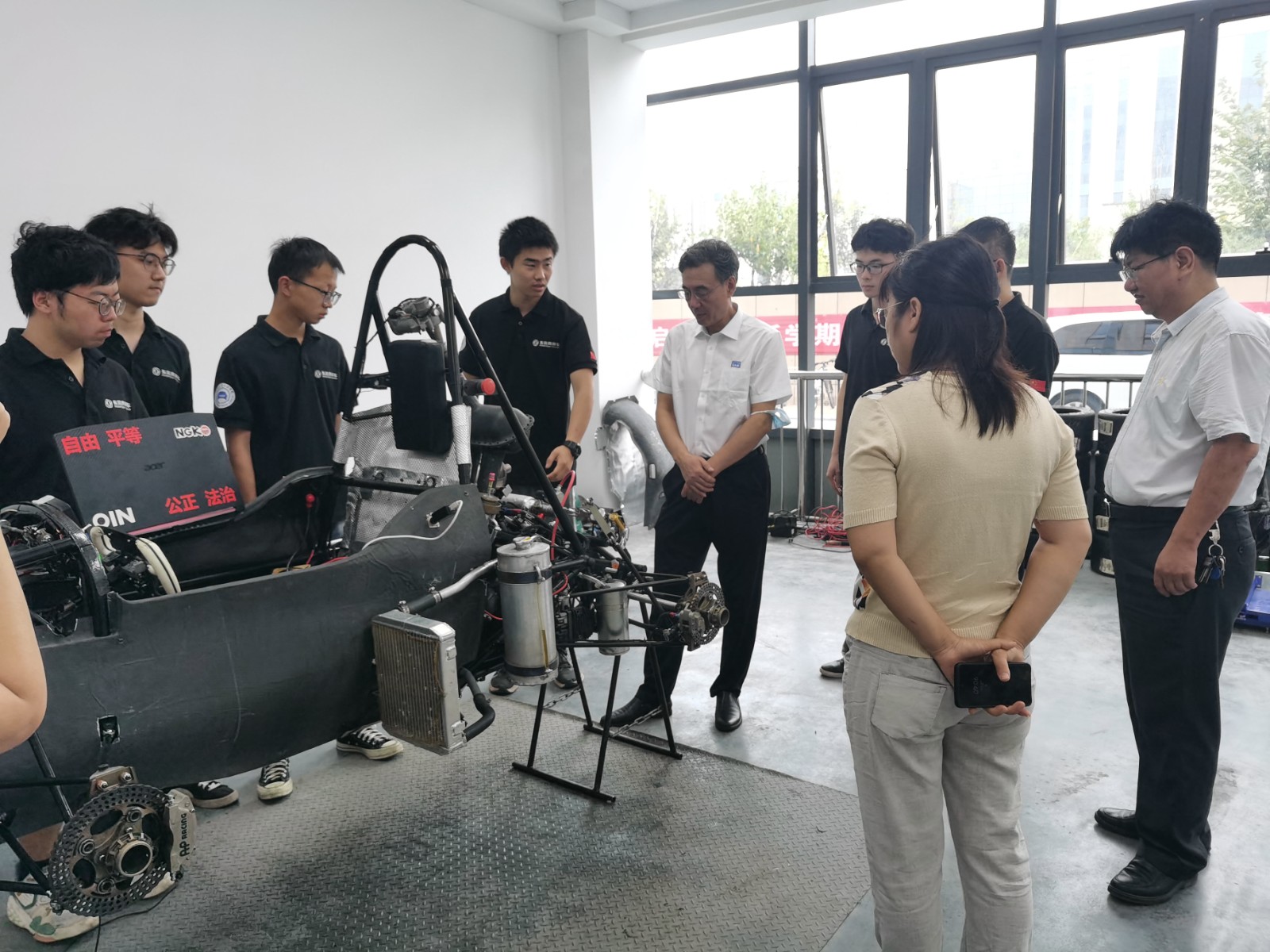 闫建来一行首先来到基地初建的FSC赛车工作坊,与车队同学们就赛车设计理念、结构特点、创新性及未来发展方向等问题进行了深入交流探讨,对新车设计提出了指导性建议。他希望同学们长怀“尊重知识,敬畏科学”之心,学好真本领,鼓励大家积极从事汽车行业,为中国汽车工业发展贡献自己的一份力量。