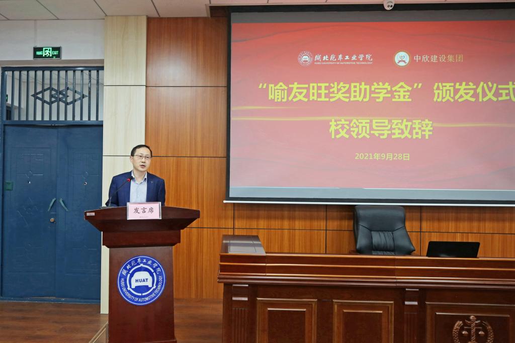 李涛致欢迎辞,代表学校向喻友旺董事长表达了最衷心的感谢和最崇高的敬意,并希望获得资助的学生勤奋进取、自强不息,把自己培养成为祖国栋梁之才,同时饮水思源、知恩图报,将来能够传递爱心、回报社会、服务人民。