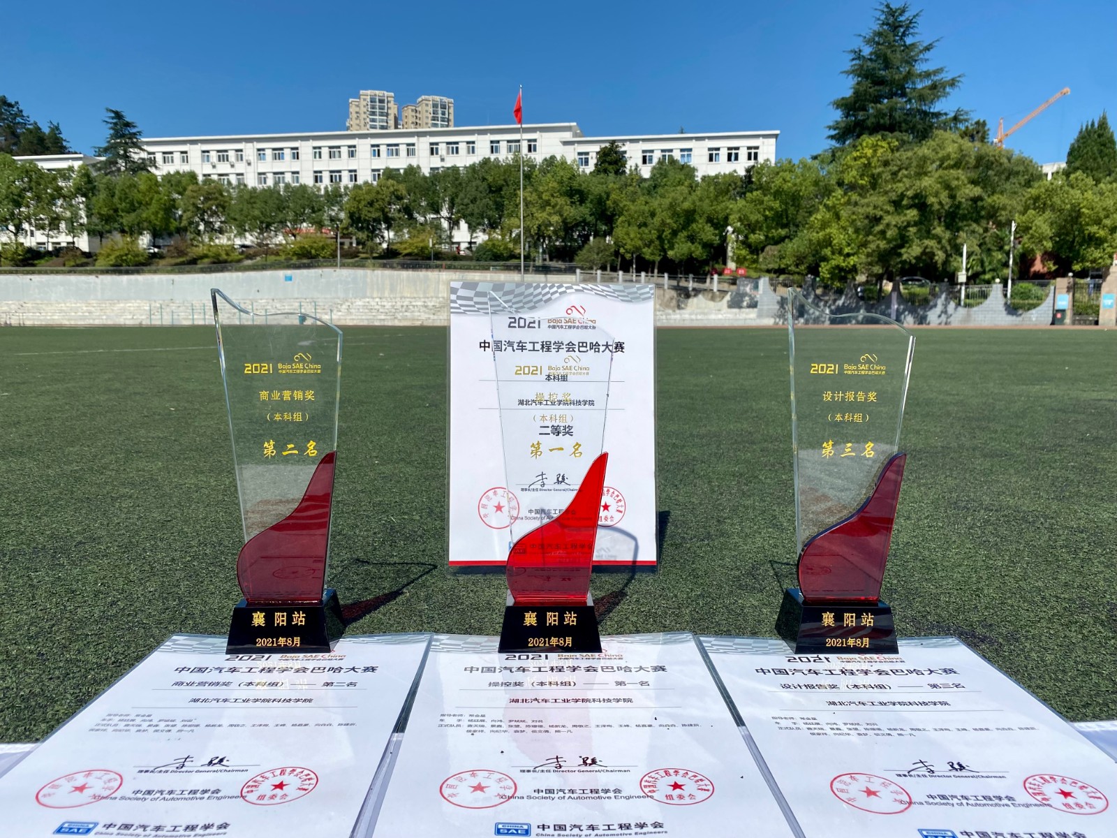本网讯(文/常金星)近日,由中国科学技术协会指导、中国汽车工程学会主办,襄阳市政府协办的“2021中国汽车工程学会巴哈大赛(襄阳站)”在襄阳市襄州区隆重开赛。来自全国各地的高等院校、职业院校共计90余支车队、1600余人参加了本届巴哈大赛。在静态赛事中,beat365科院飞翼车队队员们通过严谨、细致的讲解,用实力征服了在场的每一位评委。在动态赛事中,队员们充分展现过人的技术水平和严谨的工作态度,在比赛现场挥洒着汗水和青春,淋漓尽致的体现了飞翼人“团结、奋进、严谨、创新”的车队精神。飞翼车队一路过关斩将,最终取得本科组设计答辩第三名,商业营销第二名,操控比赛第一名,以总分967.87分位居巴哈大赛本科组第四名,力压众多985、211高校。这是飞翼车队自2016年参赛以来取得的最好成绩,也是飞翼车队在巴哈大赛中的历史性突破;单项获奖数量创历史新高,赛车设计、营销与成本奖项双双实现飞跃。
