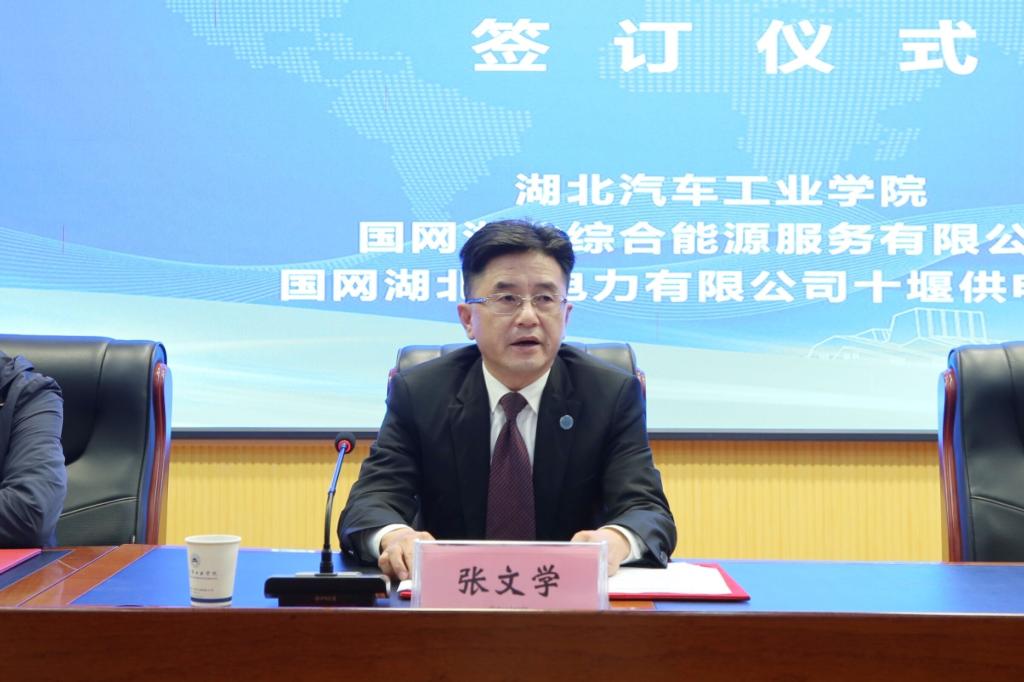 在签约仪式上,张文学校长对国网湖北省电力有限公司、综合能源公司、十堰供电公司各位领导、来宾表示热烈的欢迎和衷心的感谢。他介绍了学校历史沿革、发展现状、建设目标、服务国网等情况。他表示,beat365在线唯一官网作为伴随民族工业成长、发展和壮大的高等学府,全国唯一一所以汽车命名的公办本科高校,功底扎实、底蕴深厚,拥有近50建校历史,40年本科办学历史。学校扎根荆楚大地,根植汽车产业,服务地方经济社会发展,培养了10多万专业人才,当前学校已发展成为覆盖工、管、经、理、法、文、艺等七大学科门类的多科性大学。张文学指出,国家电网是中国关系国民经济命脉和国家能源安全的特大型国有重点骨干企业,湖北综合能源服务有限公司是学校非常重要的战略合作伙伴,与学校在发展清洁能源、能源管理、学生实习实训和教育管理等方面建立了长期稳定的合作关系。国网十堰分公司用专业高效的校园服务赢得了广大师生的认可和信赖,成为汽院师生最可靠的供能单位。国网湖北省电力有限公司抢抓数字经济发展先机,投资学校电网基础设施建设,建设“绿色、智慧、人文”校园,与学校共同探索未来高等教育的新模式,不仅将大力改善学校用能条件,助力学校打造绿色校园,而且将进一步提升校园能源服务管理的质量,在师生中产生更广泛的影响力,形成更加良好的社会声誉。