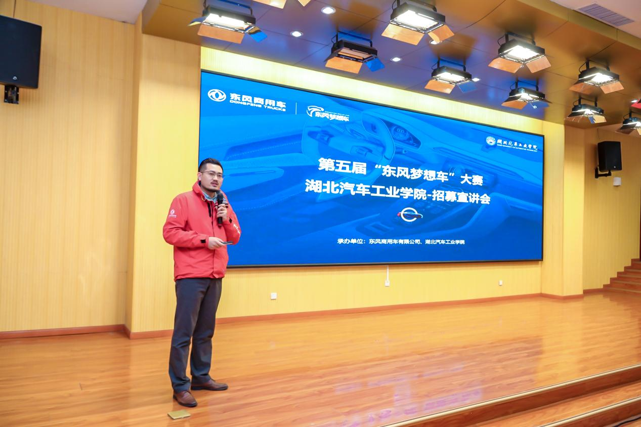 会议伊始,东风商用车技术中心车身开发部造型室主任安晨然简要介绍东风汽车公司的品牌发展、组织架构以及品牌设计等概况,并宣布第五届“东风梦想车”中国青年汽车创意设计大赛(以下简称“大赛”)课题——电动越野概念车创意设计。他指出当今国家“十四五”战略落地,需要广大青年学生的创造力;同时公司将助力人才培育、践行社会责任。“东风梦想车”中国青年汽车创意设计大赛自2014年起,已成功举办四届,此次大赛将围绕“为梦想估值”展开,赛程从2021年10月进行至2022年6月,同时公司升级训练营生态体验,并设立奖项方案和奖励方式。随后,安晨然主任就在场同学的提问作回答。