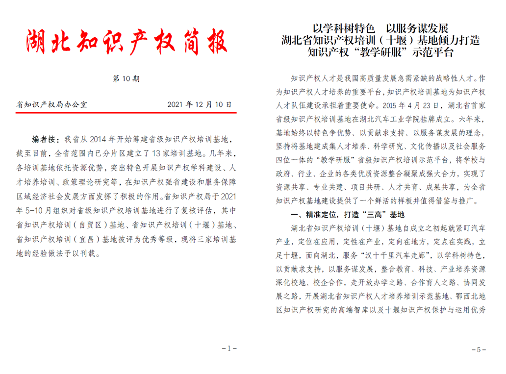 本网讯(文/肖玉杰)12月10日,省知识产权局在2021年第10期《湖北知识产权简报》上全文印发了《以学科树特色 以服务谋发展 湖北省知识产权培训(十堰)基地倾力打造知识产权“教学研服”示范平台》,并加了编者按,送国家知识产权局、省委信息综合室及分管副省长参阅。