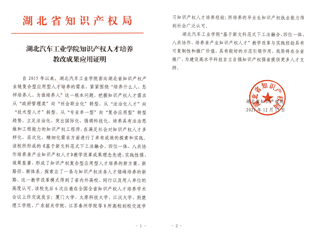 本网讯(文/肖玉杰)12月15日,湖北省知识产权局致函beat365,对beat3656年来开展知识产权创新型人才培养的做法和经验给予高度评价,认为beat365立足法治化、突出国际化、强调科技化,培养具有法治思维和工程能力的知识产权工程师的人才培养模式是一条与我省其他高校知识产权法务人才错峰培养的新路。