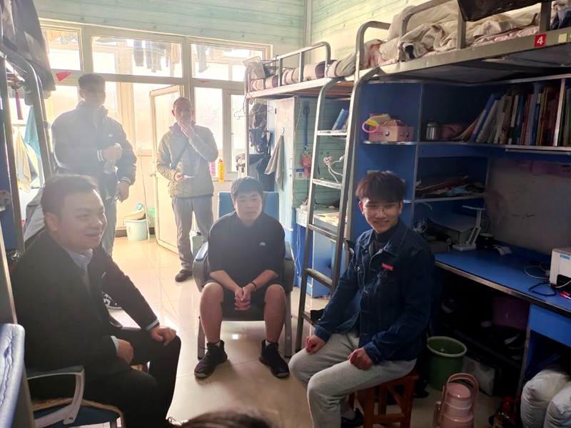 高刃一行仔细检查了各个楼层的卫生情况,就消防通道是否畅通、走廊垃圾是否及时处理、垃圾堆放等问题与同行职能部门领导进行了现场沟通和交流。随后高刃一行走进学生寝室,了解学生们的生活和学习情况。在李三404寝室,高校长坐下来与学生们进行了亲切交流,询问学生们的生活学习情况,并以自己亲身经历鼓励学生努力学习,勉励学生发挥好优秀的宿舍文化,互帮互助、共同提高,并督促提醒同学们注意寝室用电安全、做好常态化疫情防控、防范电信诈骗等。