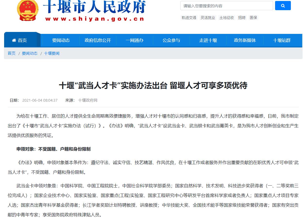 【十堰政府网】十堰“武当人才卡”实施办法出台 留堰人才可享多项优待