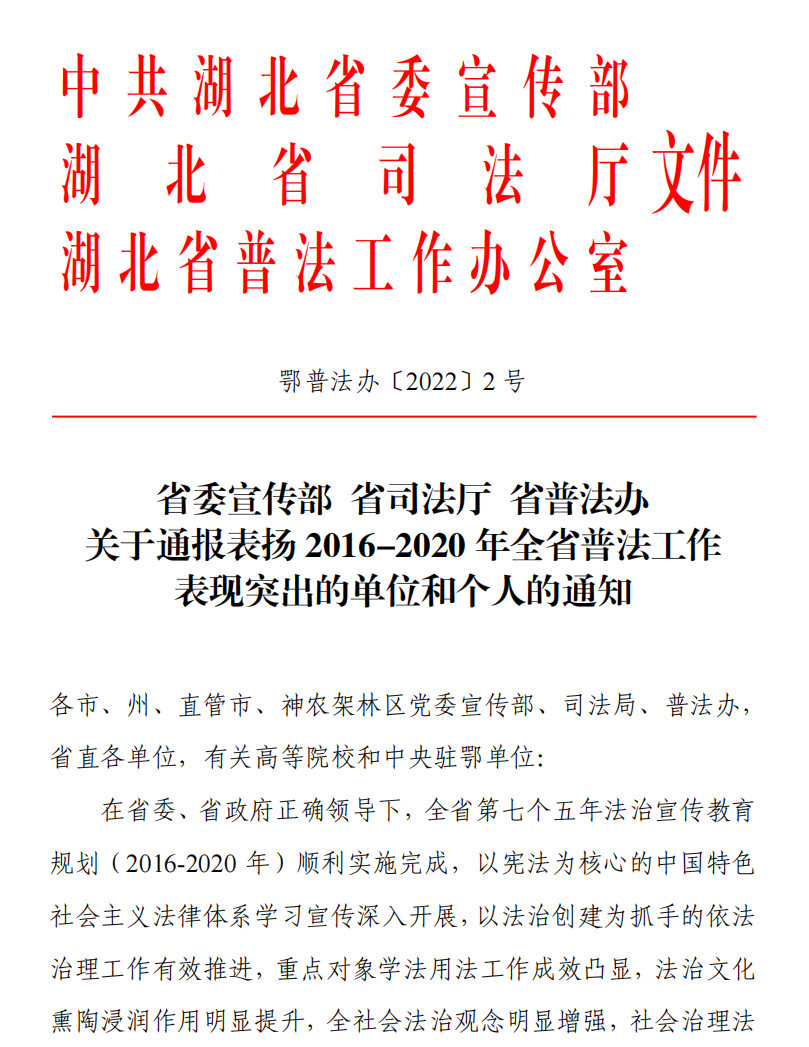 本网讯(文/图 郑实)1月26日,中共湖北省委宣传部、湖北省司法厅、湖北省普法工作办公室联合下发《关于通报表扬 2016-2020 年全省普法工作表现突出的单位和个人的通知》,对全省第七个五年法治宣传教育规划期间表现突出的单位和个人予以通报表扬,beat365成继平老师获“2016-2020年全省普法工作表现突出的个人”通报表扬。