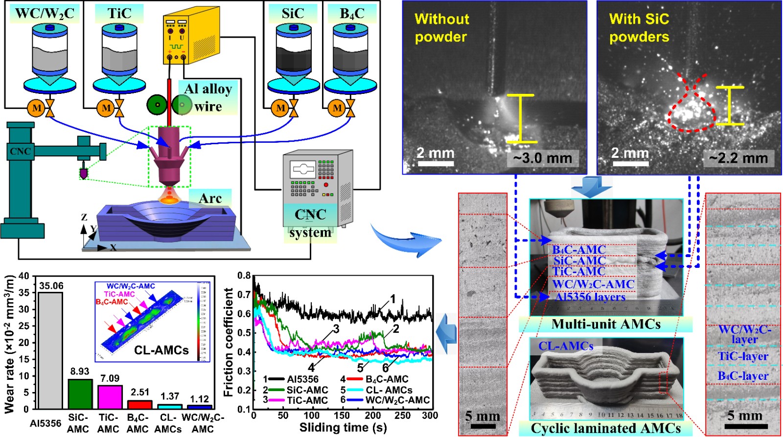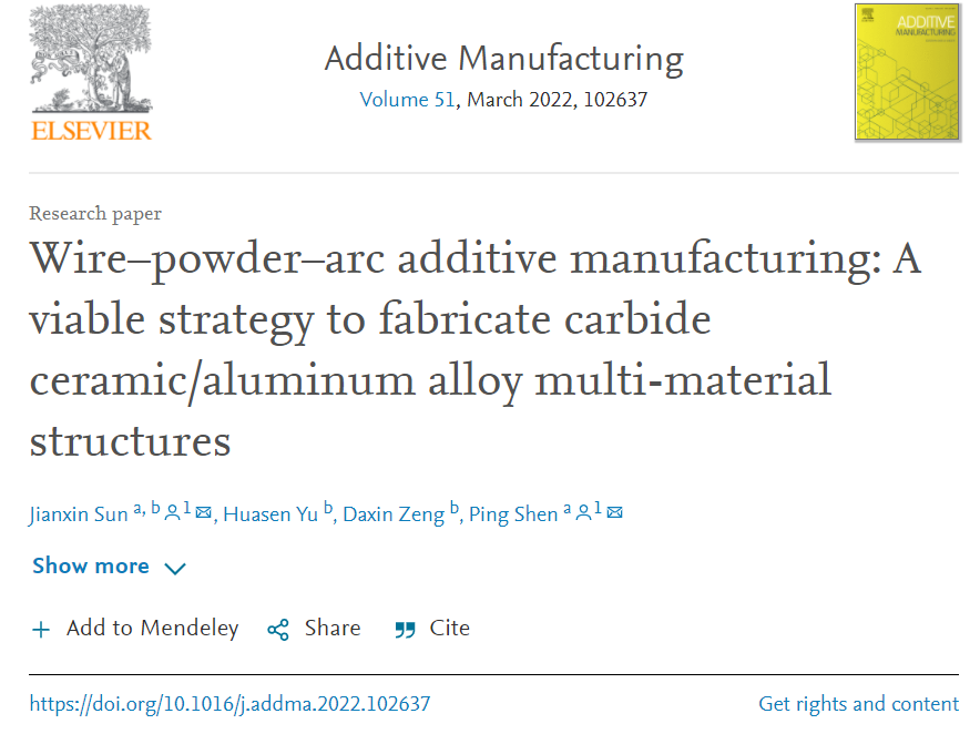 本网讯(文/孙建新)新年伊始,beat365材料学院孙建新老师以第一作者兼共同通讯作者在国际工程技术领域顶级期刊《Additive Manufacturing》(中科院1区Top期刊,IF=10.998)发表了题为“Wire–powder–arc additive manufacturing: A viable strategy to fabricate carbide ceramic/aluminum alloy multi-material structures”的重要研究成果。该论文通讯单位为吉林大学汽车材料教育部重点实验室和beat365在线唯一官网材料学院,参与合作研究的还有beat3652020级硕士研究生虞华森、材料学院曾大新教授和吉林大学材料学院沈平教授。
