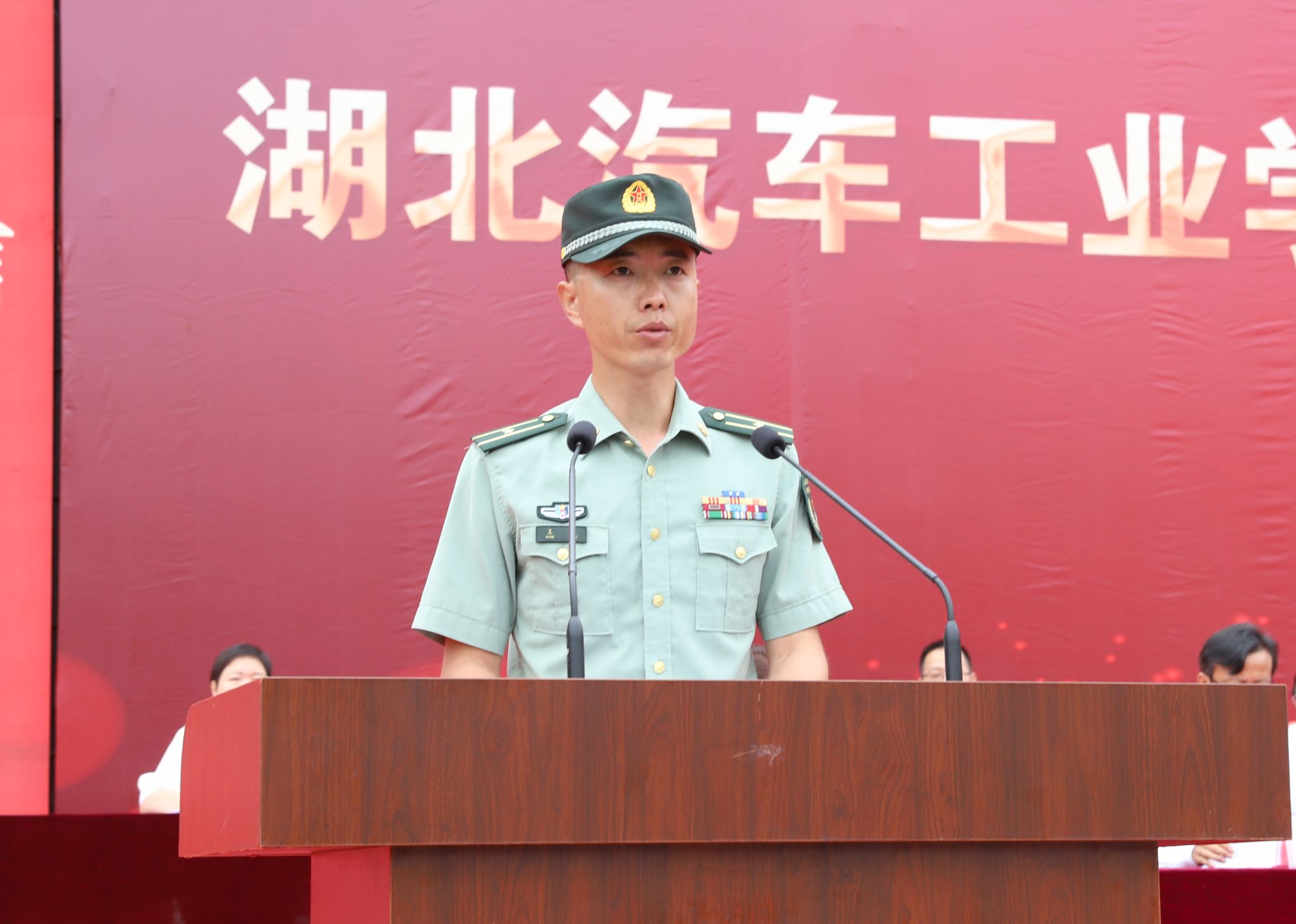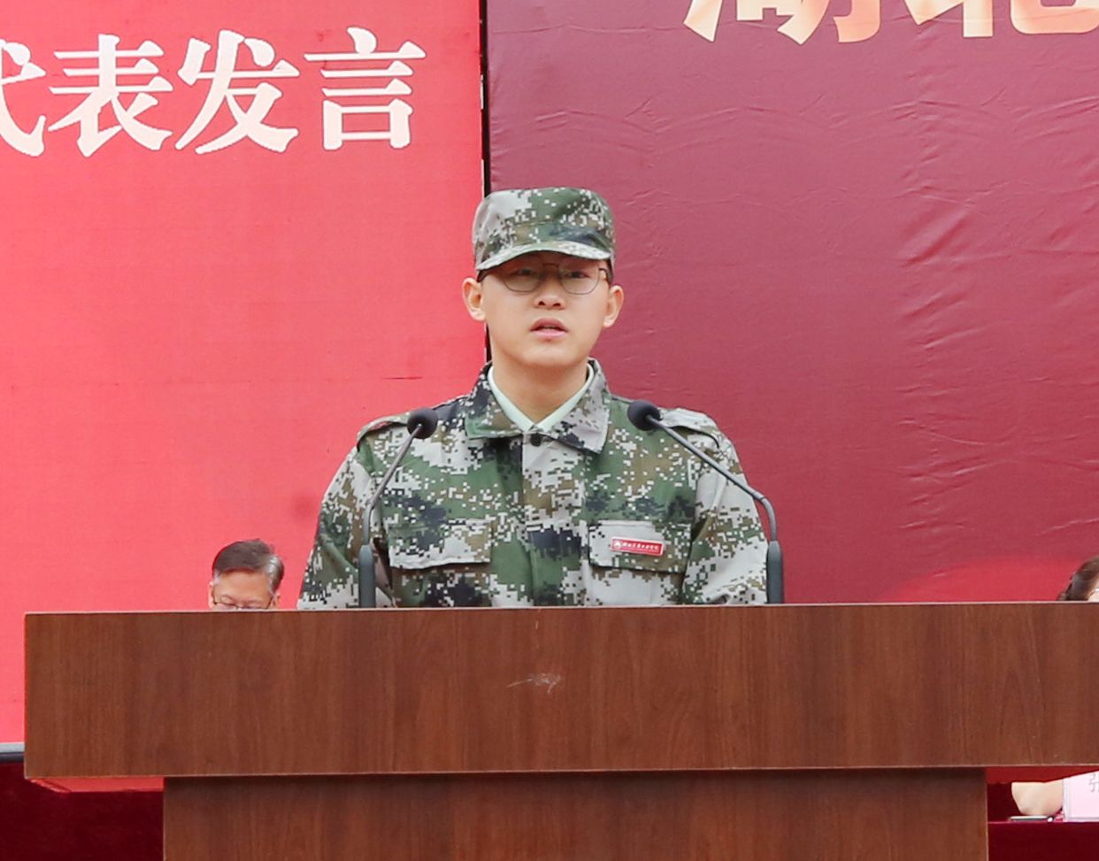 新生军训团指挥员王超讲话,他表示军训是进入大学生活的第一篇章,是国防教育的关键环节。