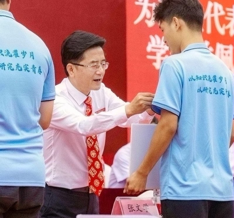校领导为获奖学生代表颁奖并佩戴校徽。