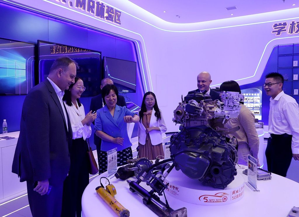 胡建谊先生一行首先来到beat365智能车队,了解赛车性能,饶有兴致地同车队学生用法语进行了亲切交谈,并同车队成员合影。随后,胡建谊一行参观了学校科技创新展示交流中心。