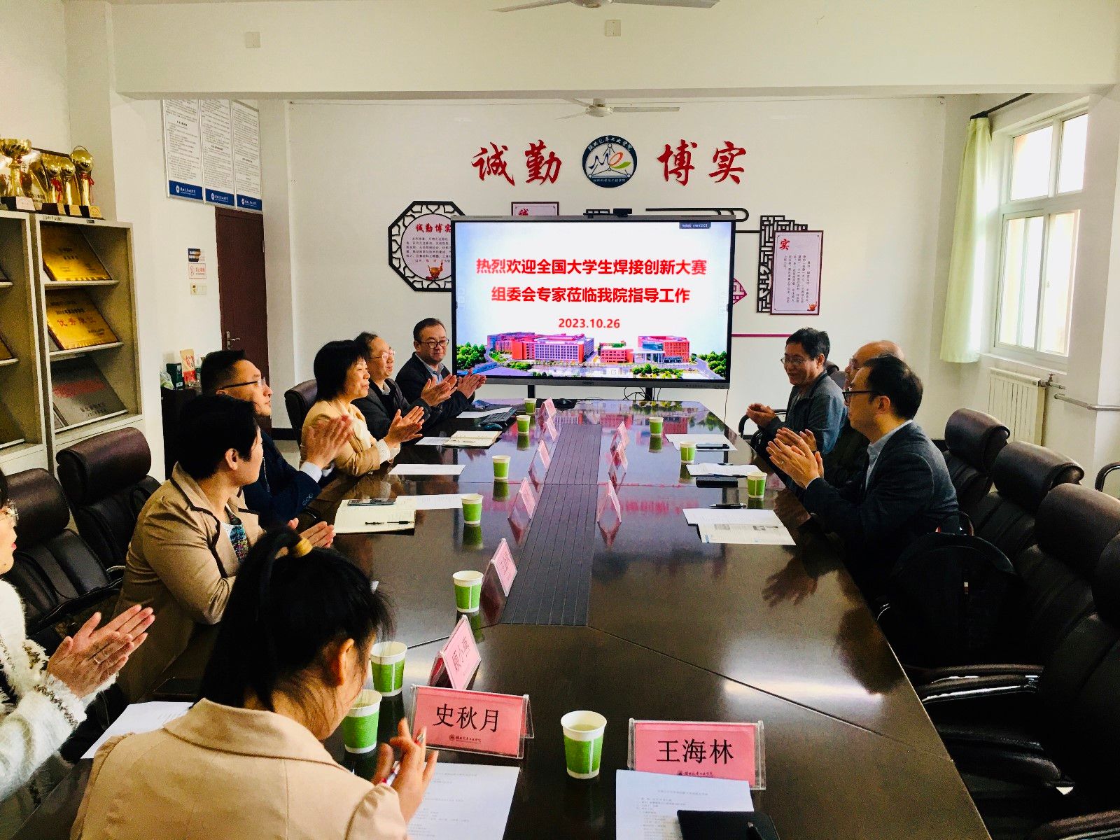 本网讯(文/王海林)10月26日,全国大学生焊接创新大赛组委会专家组现场考察会在材料学院506会议室召开。考察组由中国机械工业教育协会焊接技术与工程委员会副主任委员、焊接大赛组委会成员、天津大学李桓教授和杨立军教授,马斯康信息技术有限公司育才主任李幸呈组成。副校长张红霞,创新创业学院院长陶伟,材料学院院长黄海铭、副院长刘峰,教师王金凤、顾小燕、王海林、史秋月出席会议,会议由副院长刘峰主持。