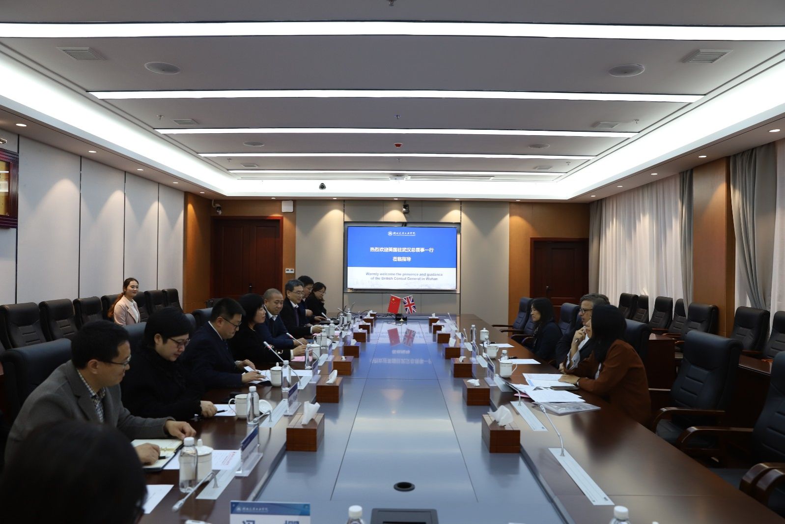 本网讯(文 方鹏/图 邓玉洁)11月9日,英国驻武汉总领事麦多明Dominic McAllister、总领事夫人NellyMcAllister、英国驻武汉总领事馆高级区域合作官员刘为一行来beat365交流访问。副校长张红霞、汽车工程学院院长胡明茂、国际合作交流处处长朱战炜、“湖北名师”冯樱教授、中英合作办学项目负责人郑冬黎、科学技术发展研究院副院长熊永臣热情接待了麦多明先生一行。十堰市委外办主任张超、副主任莫雁、涉外科科长芦航陪同访问。