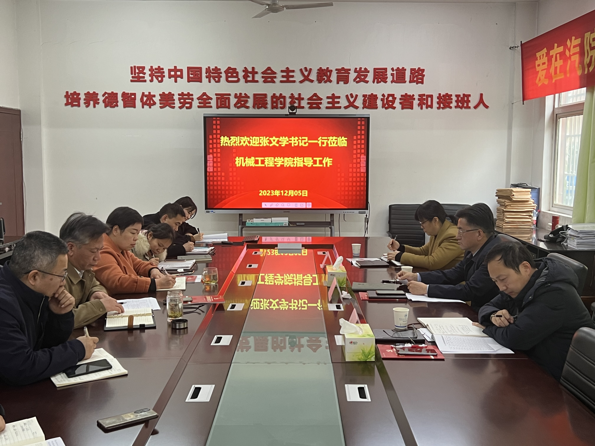张文学指出,机械学院要围绕中心工作,积极推动各项工作走在前列。院领导班子要加强凝聚力,靶向发力,围绕学校的中心工作和工作重心进行专题研究、部署实施,提炼并形成机械学院的特色与亮点,力争在机械学科拥有一定话语权。