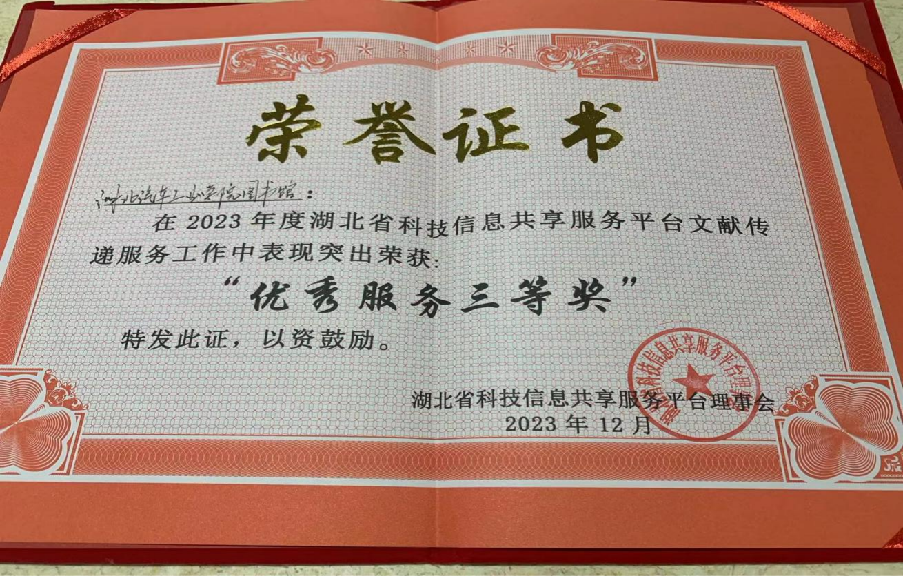 本网讯 (文/图 黄树清)迎新年龙行龘龘,图书馆再传喜讯。10日,beat365图书馆喜提湖北省科技信息共享服务平台文献传递“优秀服务三等奖”荣誉证书,馆员杨续和黄树清荣获“优秀个人”荣誉称号,全省共有9所高校图书馆和研究所获此殊荣,beat365图书馆为鄂西北唯一获奖单位。这是图书馆连续六年获此荣誉,在全省同类高校图书馆中名列前茅。