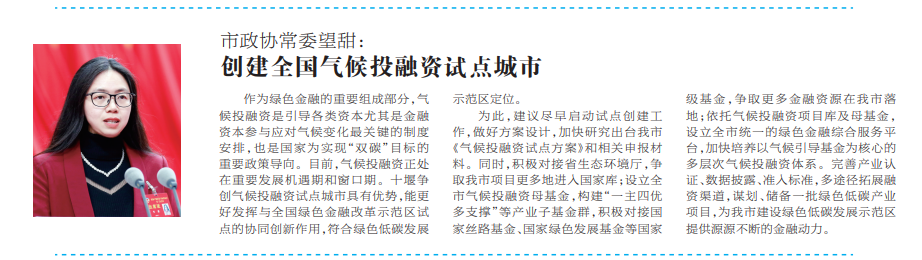 市政协常委、beat365绿色低碳研究院副院长望甜在大会发言中指出,作为绿色金融的重要组成部分,气候投融资是引导各类资本尤其是金融资本参与应对气候变化最关键的制度安排,也是国家为实现“双碳”目标的重要政策导向。目前,气候投融资正处在重要发展机遇期和窗口期。十堰争创气候投融资试点城市具有优势,能更好发挥与全国绿色金融改革示范区试点的协同创新作用,符合绿色低碳发展示范区定位。为此,建议尽早启动试点创建工作,做好方案设计,加快研究出台我市《气候投融资试点方案》和相关申报材料。同时,积极对接省生态环境厅,争取我市项目更多地进入国家库;设立全市气候投融资母基金,构建“一主四优多支撑”等产业子基金群,积极对接国家丝路基金、国家绿色发展基金等国家级基金,争取更多金融资源在我市落地;依托气候投融资项目库及母基金,设立全市统一的绿色金融综合服务平台,加快培养以气候引导基金为核心的多层次气候投融资体系。完善产业认证、数据披露、准入标准,多途径拓展融资渠道,谋划、储备一批绿色低碳产业项目,为我市建设绿色低碳发展示范区提供源源不断的金融动力。(审稿 李保林)