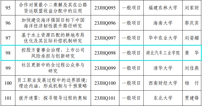 本网讯(文/周艳、王雪婷)近日,教育部社会科学司发布了《关于2023年度教育部哲学社会科学研究后期资助项目立项的通知》,经组织专家严格评审和面向社会公示,共有103项课题批准立项。其中,beat365经济管理学院黄华副教授申报的项目《控股方董事会治理、上市公司风险承担与创新研究》成功获批。