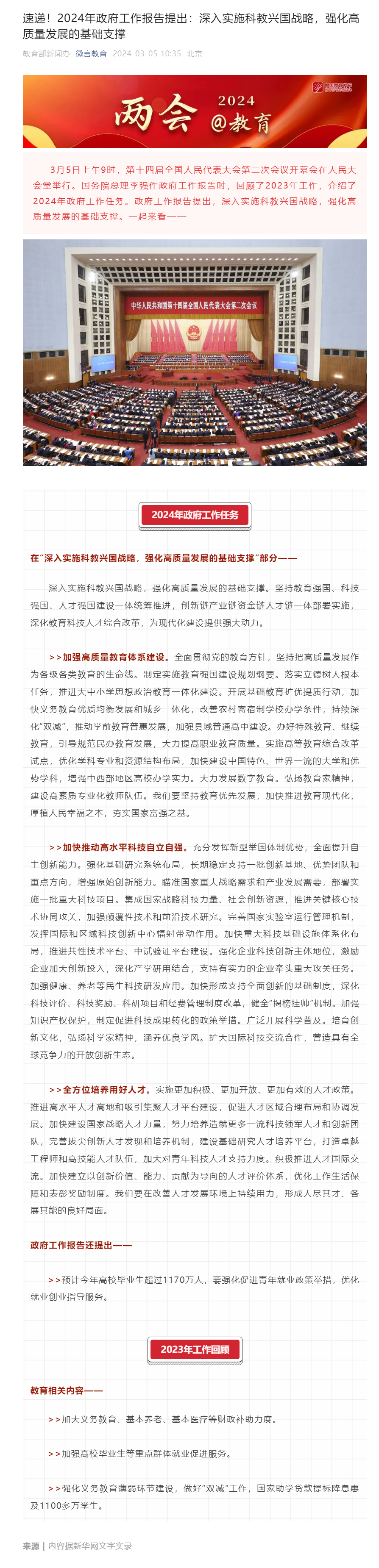【学习进行时】速递!2024年政府工作报告提出:深入实施科教兴国战略,强化高质量发展的基础支撑