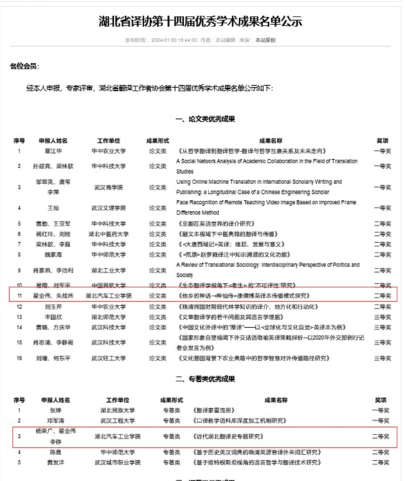 七、学科标志性成果取得历史突破。累计发表CSSCI论文2篇,SSCI论文1篇,三报一刊高水平论文3篇,出版《近代湖北翻译史专题研究》《三尖树时代》等著译成果2部,围绕翻译研究获批中国外语教材项目、湖北省人文社科重点项目3项,横向语言服务到账经费达40.1万。同时获得两项省级协会学术成果奖。