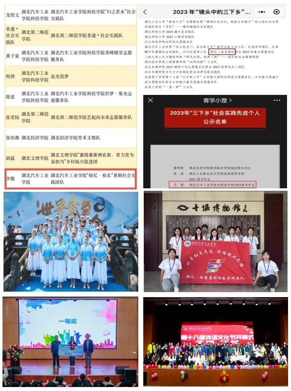 十、团学育人取得新成绩。围绕“引领凝聚青年、组织动员青年、联系服务青年”三条主线,打造外语特色团学品牌取得新成绩。成功举办第十八届“用外语讲好中国故事”外国语文化节系列活动;探忆·裕农团队入选团省委“三下乡”社会实践“共同缔造青年助力”重点团队;荣获2023大学生社会实践成果“千校千项”网络展示活动项目优秀奖,2023年“镜头中的三下乡”征集活动优秀视频团队,荣获2023年“三下乡”省级社会实践先进个人1人次;13人获省级优秀志愿者;英语191班团支部获评全国高校“活力团支部”最具组织力奖,并进入TOP100榜单;荣获求职大赛校赛一等奖、十堰市二等奖、第九届“东方财富杯”全国大学生金融挑战赛二等奖。《问今教育》团队项目荣获“互联网+”省级银奖。