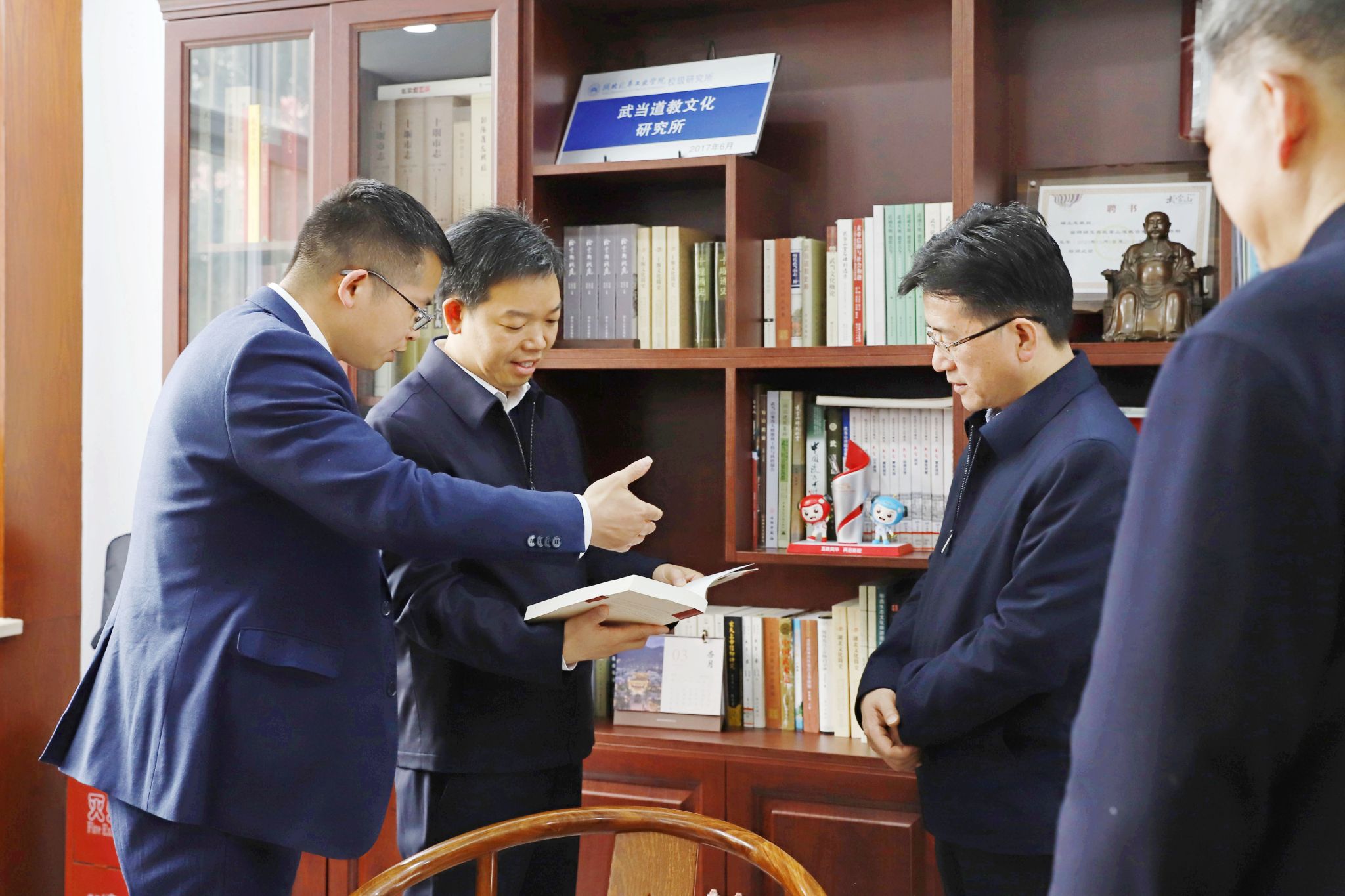 汤红兵一行还参观了学校北区、校史馆、武当文化研究与传播中心和科技创新展示中心,实地了解学校的整体办学情况以及校园文化建设、科学研究等情况。