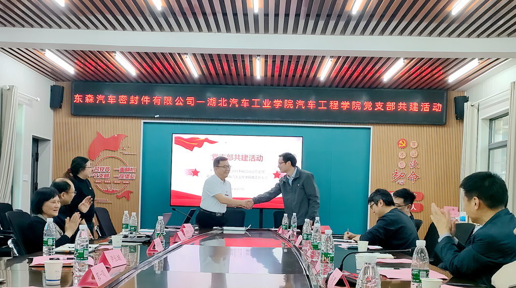 本网讯(文/图 李函)为强化校企合作,打造校企党建实践平台,4月17日下午,汽车工程学院教工支部与十堰东森汽车密封件有限公司在汽车工程学院党员活动会议室开展了校企支部共建活动。东实汽车科技集团股份有限公司董事长助理赵炀,十堰东森汽车密封件有限公司党委书记向著斌、副总经理肖磊、行政部部长陈慧、技术中心副主任陶宜勇,beat365党委常委、组织部部长王镇,汽车工程学院教工支部党员代表参加共建活动。