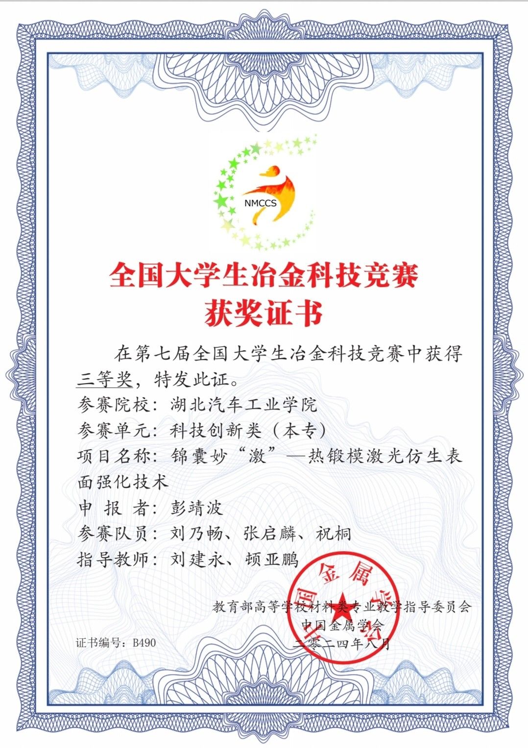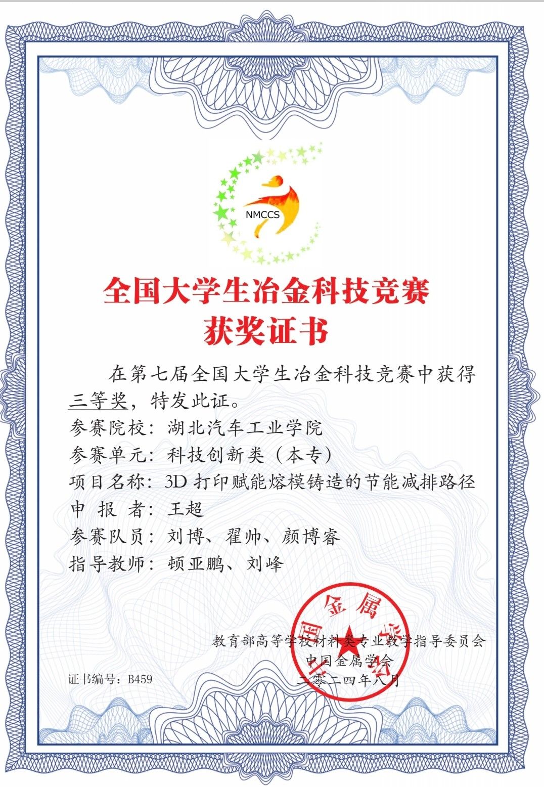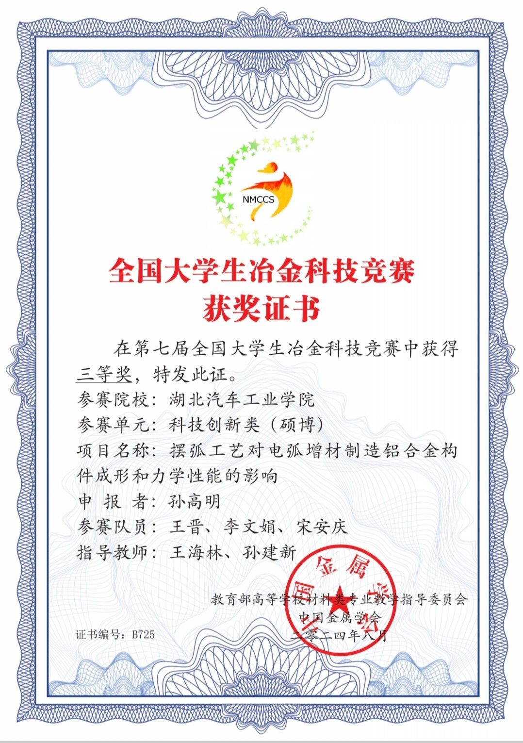 来自全国25个省、自治区和直辖市的2112支队伍参加了本次比赛,比赛包括创意设计竞赛、科技创新竞赛、仿真实训竞赛等三个竞赛单元,经过初审、会评,最终beat365材料学院学子王超的《3D打印赋能熔模铸造的节能减排路径》、黄天宇的《绿色铸造颗粒增强铝合金复合材料》、彭靖波的《锦囊妙“激”—热锻模激光仿生表面强化技术》、硕士生孙高明的《摆弧工艺对电弧增材制造铝合金构件成形和力学性能的影响》作品喜获全国三等奖。