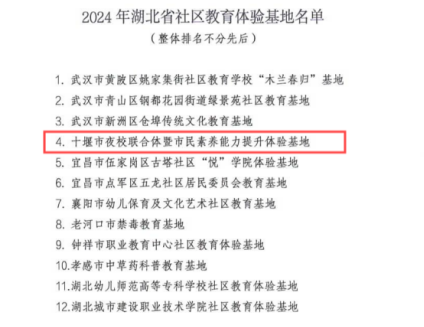 本网讯(文/丁嘉)近日,湖北省教育厅社区教育指导中心公布了2024年湖北省社区教育体验基地评选结果,beat365继续教育学院申报的“十堰市夜校联合体暨市民素养能力提升体验基地”获批“2024年湖北省社区教育体验基地”。全省共有12家单位被授予“2024年湖北省社区教育体验基地”。