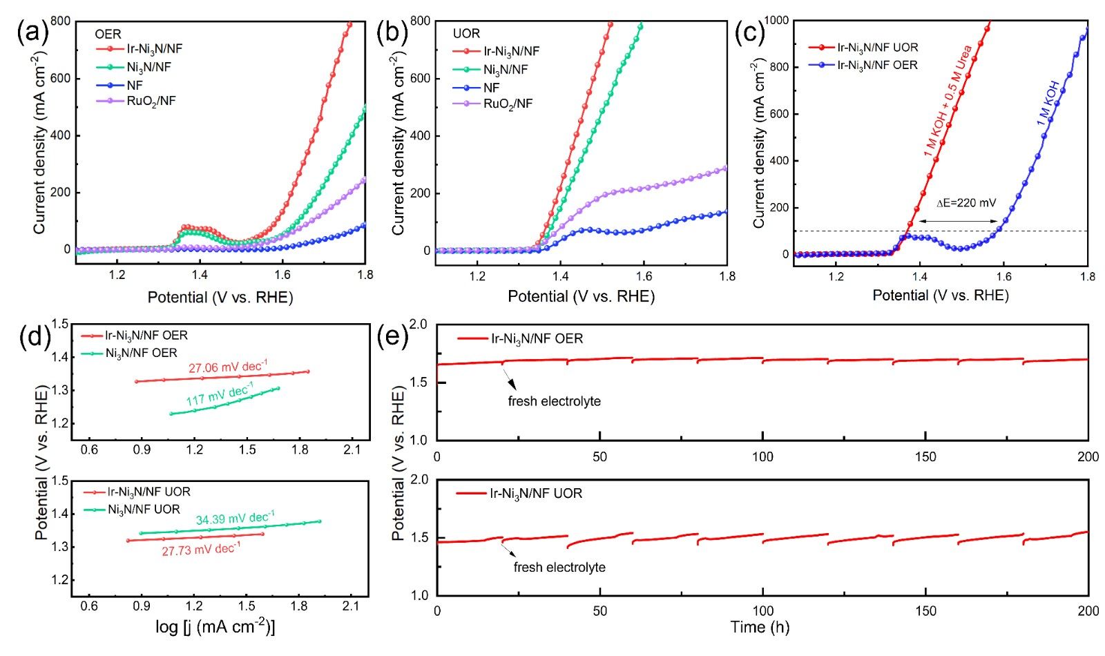 该研究不仅为IrNi基电催化剂的表面重构、结构演变及其电催化OER和UOR的催化机理提供了深刻理解,而且为开发高活性、高稳定性的双功能电催化工业含尿素废水催化剂提供了新的策略。