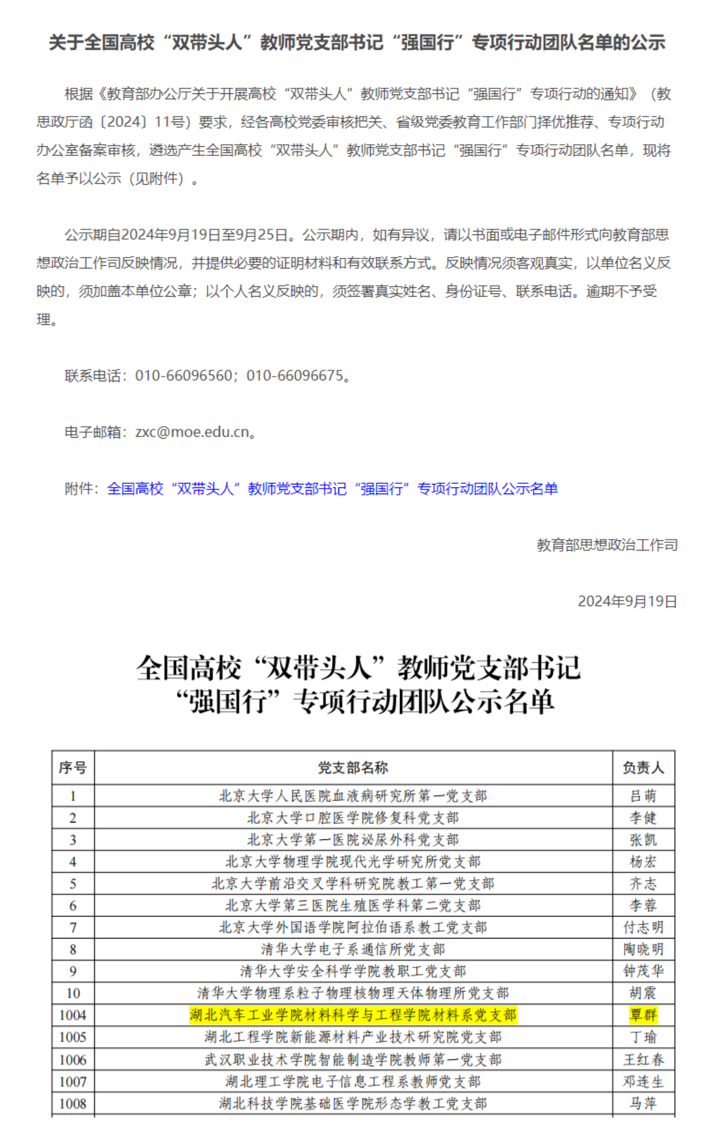 本网讯(文 王雪雪/图 覃群)日前,教育部办公厅公布《关于全国高校“双带头人”教师党支部书记“强国行”专项行动团队名单的公示》,beat365材料科学与工程学院材料系党支部成功入选。