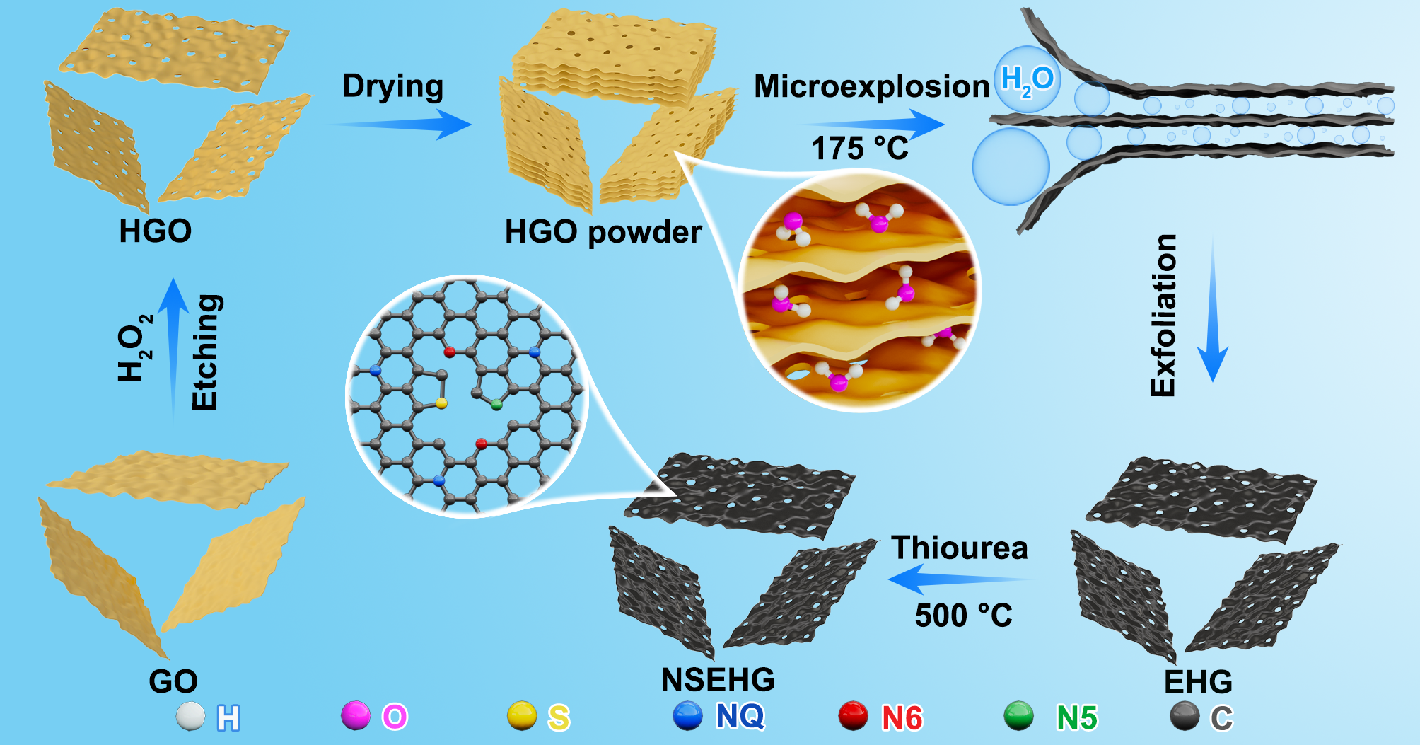由于钾储量丰富、成本低、K+/K的氧化还原电位低(−2.92 Vvs−3.04 V的Li+/Li),钾离子电池(PIBs)被认为是LIBs的有前途的替代品。然而,K+半径(0.138 nm)相对较大(Na+,0.102 nm)和(Li+,0.076 nm),不可避免地导致材料在钾化/脱钾过程中严重的体积膨胀和缓慢的反应动力学,这通常会带来较差的倍率能力和较差的循环稳定性。因此,本研究提出了低温微爆炸辅助热剥离法对多孔氧化石墨烯(HGO)进行低温快速剥离制备多孔石墨烯。以硫脲为N源和S源对制备的多孔石墨烯(EHG)进行掺杂制备N/S共掺杂剥离多孔石墨烯(NSEHG)。得益于超高的吡啶/吡咯氮含量(90.6 at.%)、大层间距(0.423 nm)以及多孔结构,NSEHG用作负极时具有优异的储钾(0.05和10 A·g−1时可逆放电比容量分别为621和155 mAh·g−1)和储钠(0.05和10 A·g−1时可逆放电比容量分别为461和137 mAh·g−1)性能。