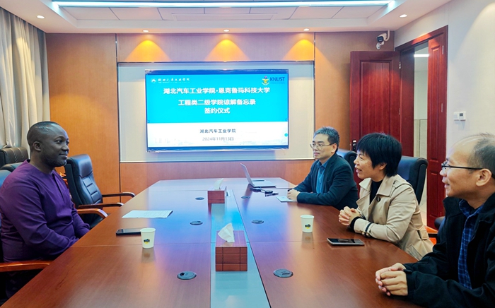 本网讯(文/图 方鹏、熊永臣)11月13日下午,学校与加纳恩克鲁玛科技大学工程类教育谅解备忘录签约仪式在产教大楼三楼312会议室举行。会前,党委常委、副校长张红霞热情接待了加纳恩克鲁玛科技大学国际处处长丹尼尔·杜阿教授。