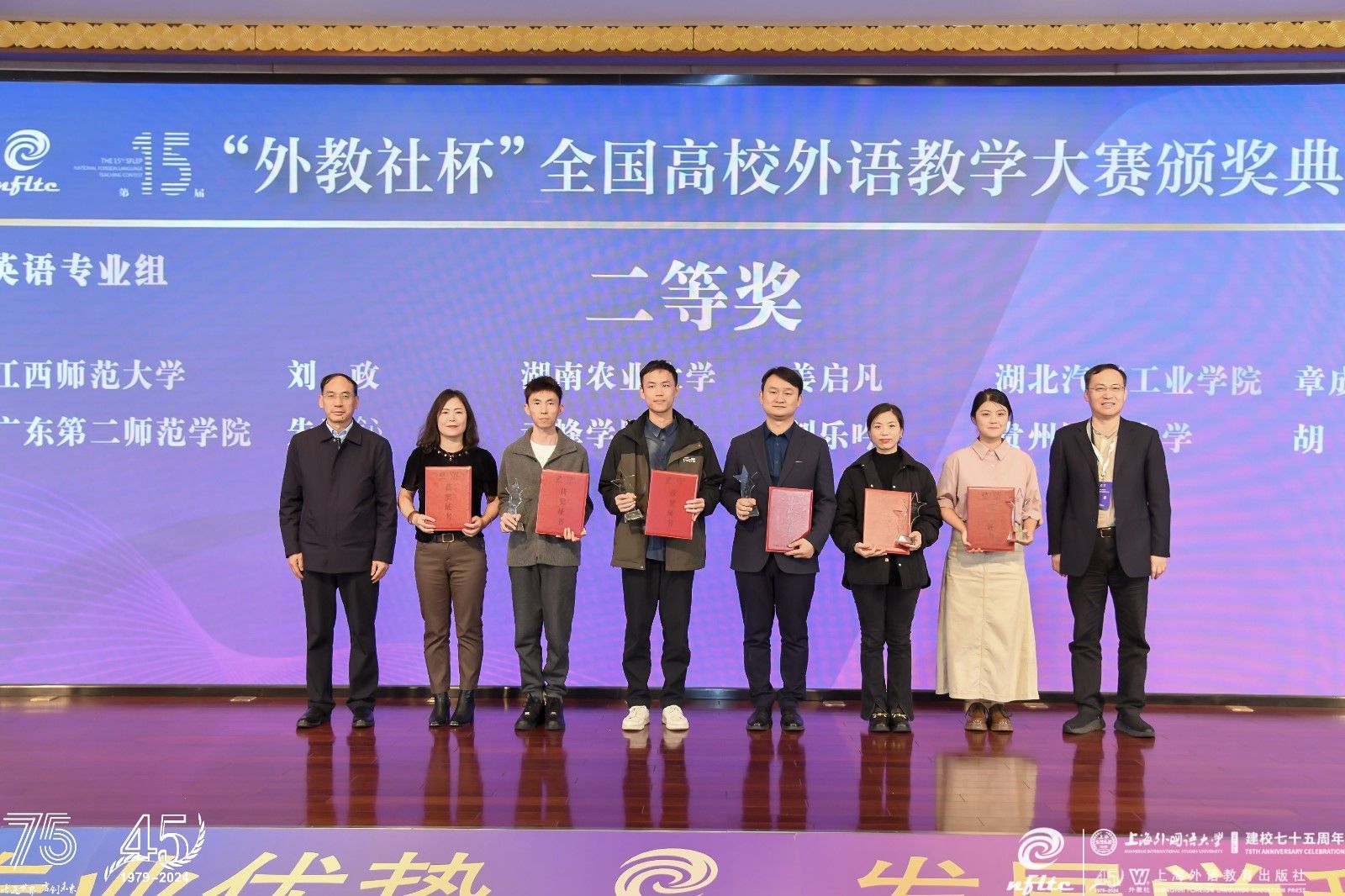 本网讯(文/文 任俊超、龙凌)12月6日至8日,第十五届“外教社杯”全国高校外语教学大赛全国决赛、总决赛在上海市举行。beat365外国语学院教师章成成喜获英语专业组全国二等奖,由其带领的教学团队获得“教学设计奖”全国二等奖,突破beat365历史最好成绩记录。