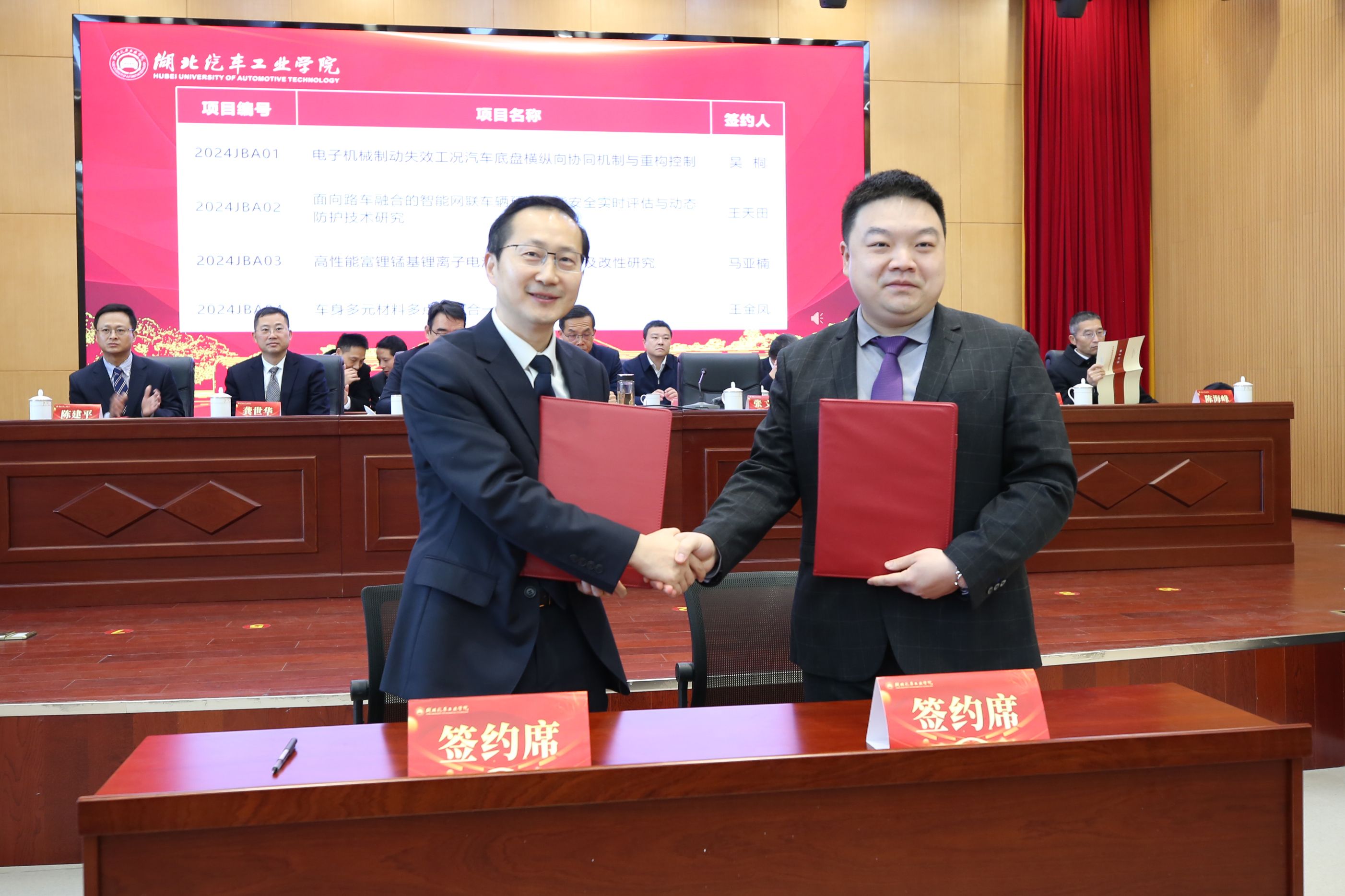 王晓校长为2024年高质量科研业绩获奖代表颁发奖金。党委副书记李涛分别与“揭榜挂帅”项目团队代表签订“揭榜挂帅”立项任务书。与会领导分别为重点科研平台负责人代表、“科研标兵”、“优秀科技工作者”“科技工作先进集体”颁发证书与奖杯。采埃孚汽车安全系统(武汉)有限公司、湖北飞歌科技股份有限公司、万润新能源、东风汽车动力零部件有限公司等企业代表分别与学校科研团队签订重大产学研合作协议书。
